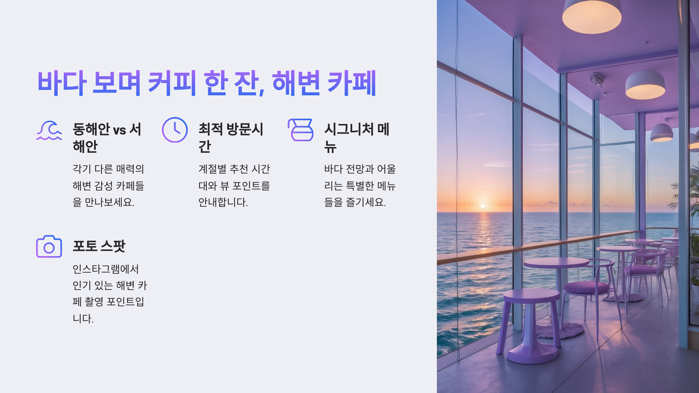속초의 '테라로사'는 넓은 창으로 동해 바다를 한눈에 담을 수 있고, 여수의 '루프탑366'은 노을 지는 저녁시간에 가장 아름다워요. 제주도 협재 앞에 위치한 '봄날카페'는 제주를 대표하는 인생샷 명소 중 하나랍니다.