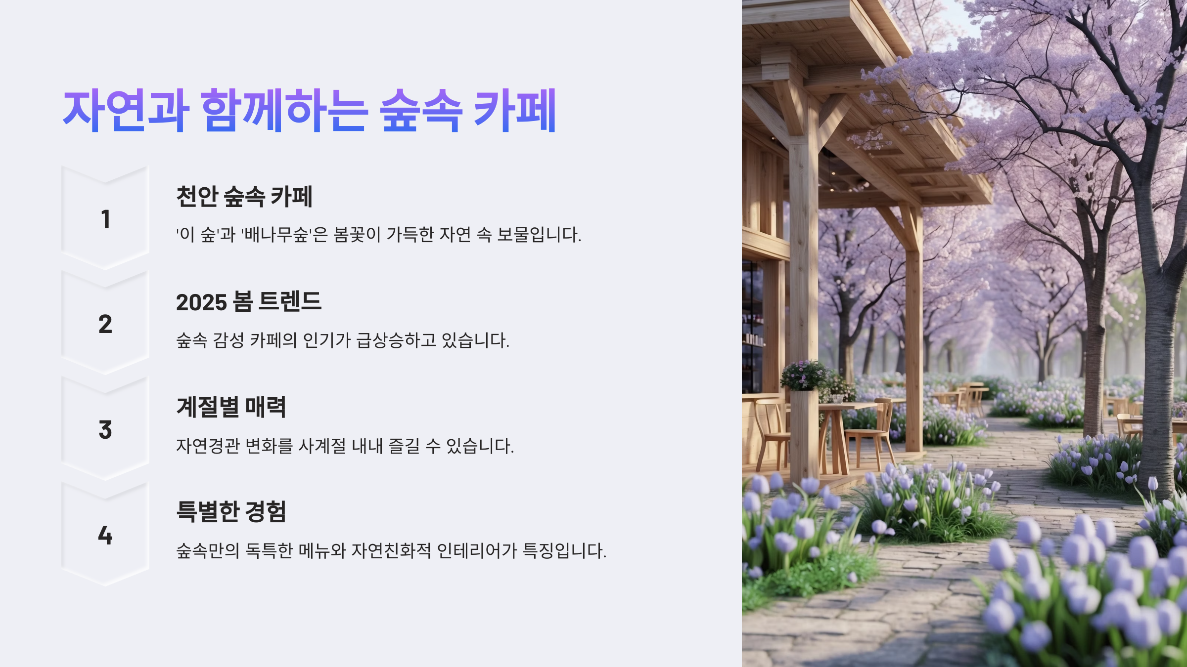 | 숲속 카페 | 조용하고 편안함 | 자연 힐링 |