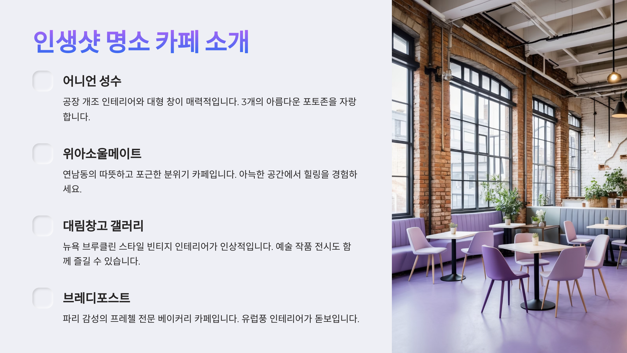 가볍게 외출하는 기분으로 떠날 수 있어 더욱 매력적인 이 카페들은 일상 속 작은 여행처럼 느껴져요. 짧지만 강렬한 리프레시가 필요할 때 최고의 선택이 될 수 있어요.
