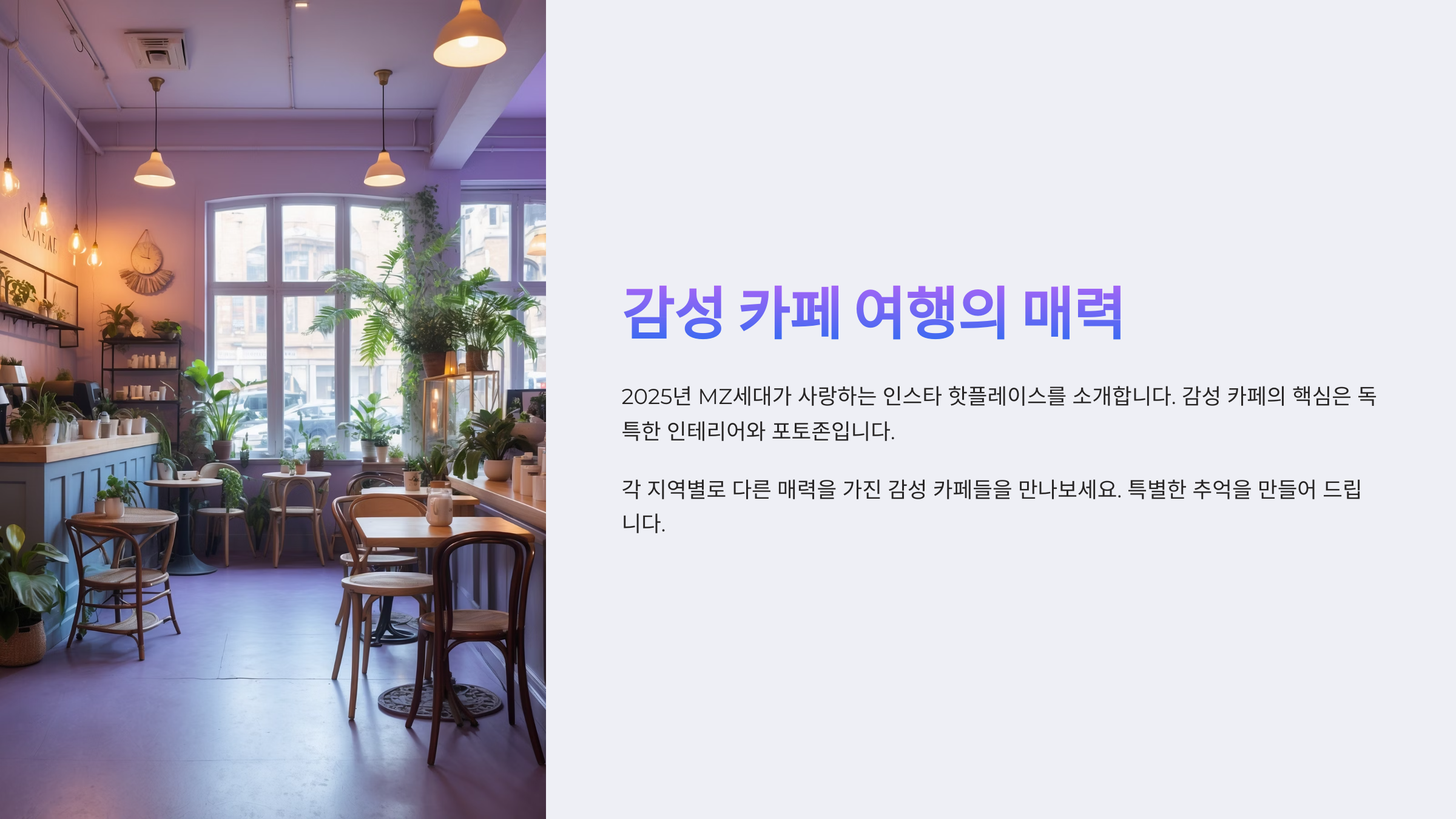 이번 글에서는 지금 당장 떠나고 싶게 만드는 전국의 힐링 감성 카페들을 소개할게요. 저마다 특별한 매력을 가진 카페들이 기다리고 있으니, 가볍게 읽으며 오늘은 어디로 떠날지 함께 상상해봐요.