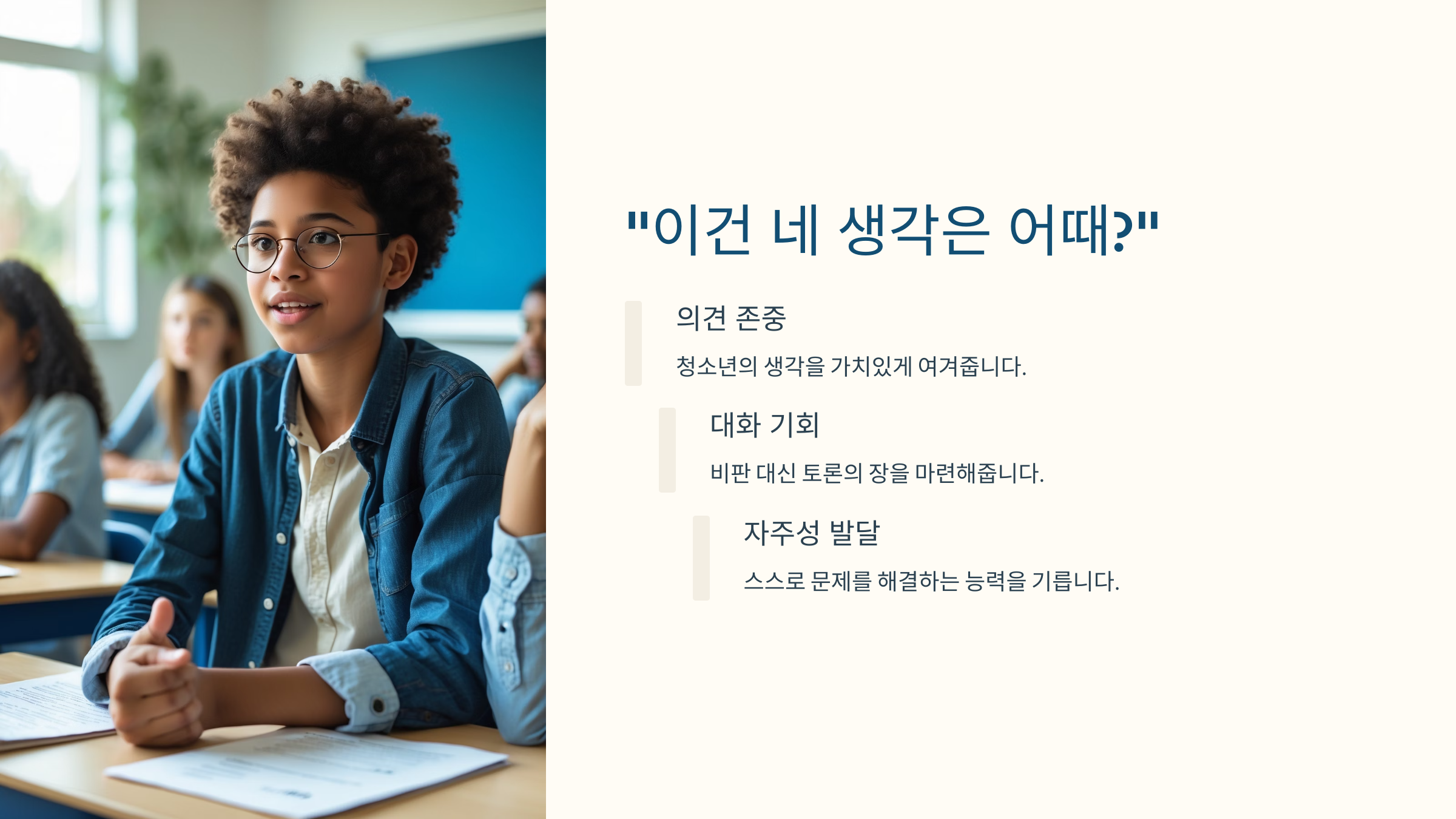 10대는 자기 의견이 무시당한다고 느낄 때, 반항하거나 닫혀버리는 경향이 있어요. 이런 상황에서 대화를 여는 가장 효과적인 방법이 바로 “너는 어떻게 생각해?”예요. 🎤