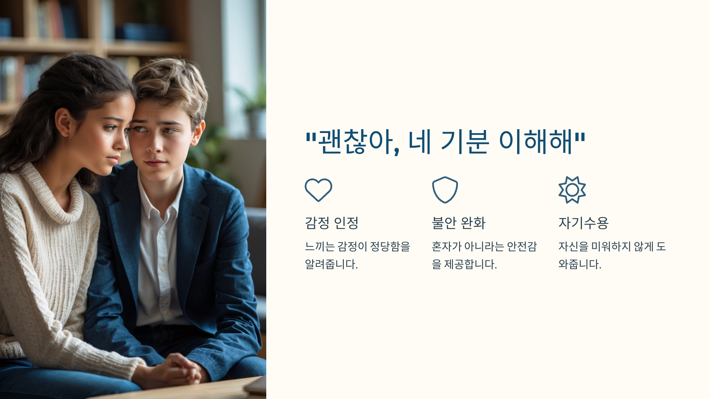 감정이 불안정한 10대는 “혼자 해야 한다”는 느낌에 스트레스를 크게 받아요. 이때 “같이 해보자”는 말은 부담을 줄이고 마음을 여는 열쇠가 돼요. 🧩