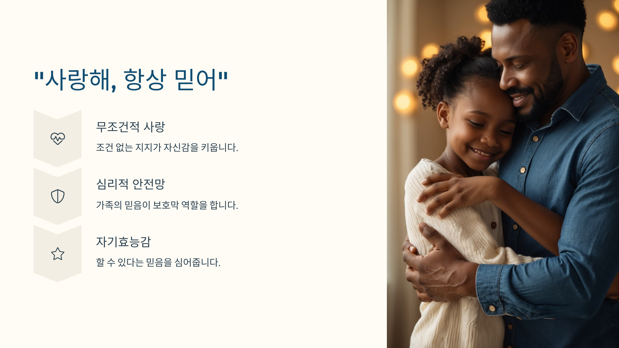 “사랑해”라는 말은 감정을 안정시켜주고, 아이의 자존감을 키워줘요. “항상 믿어”라는 말도 마찬가지로 아이에게 깊은 신뢰를 전달해요.