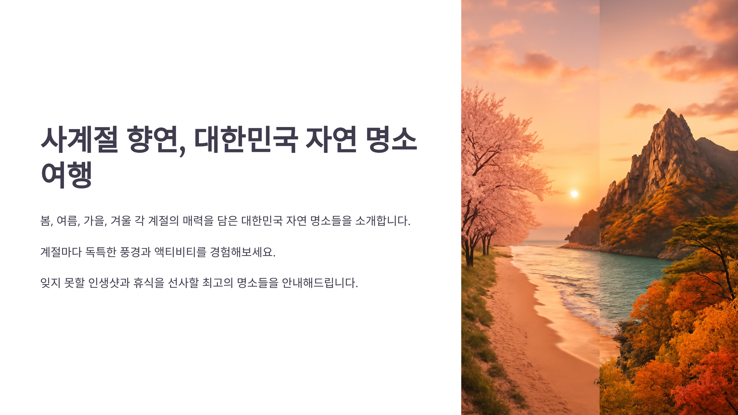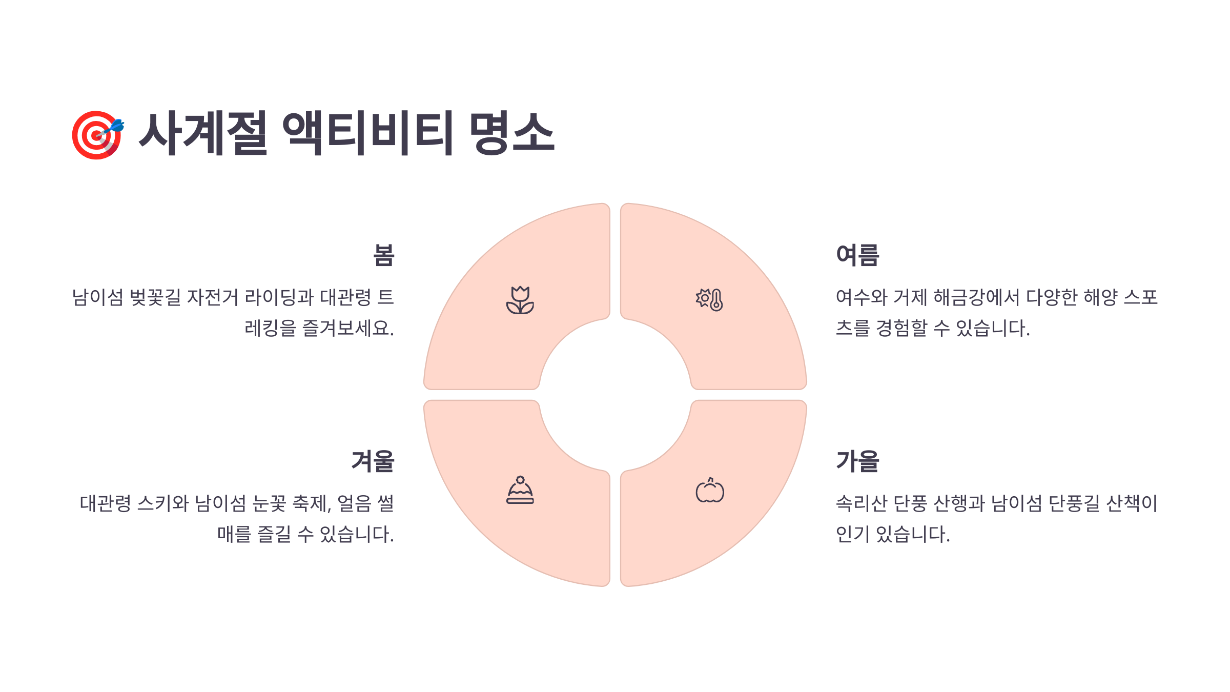 사계절 명소는 매 시즌 분위기가 달라져요. 봄과 여름엔 활기차고, 가을과 겨울엔 잔잔한 힐링을 줄 수 있어요.