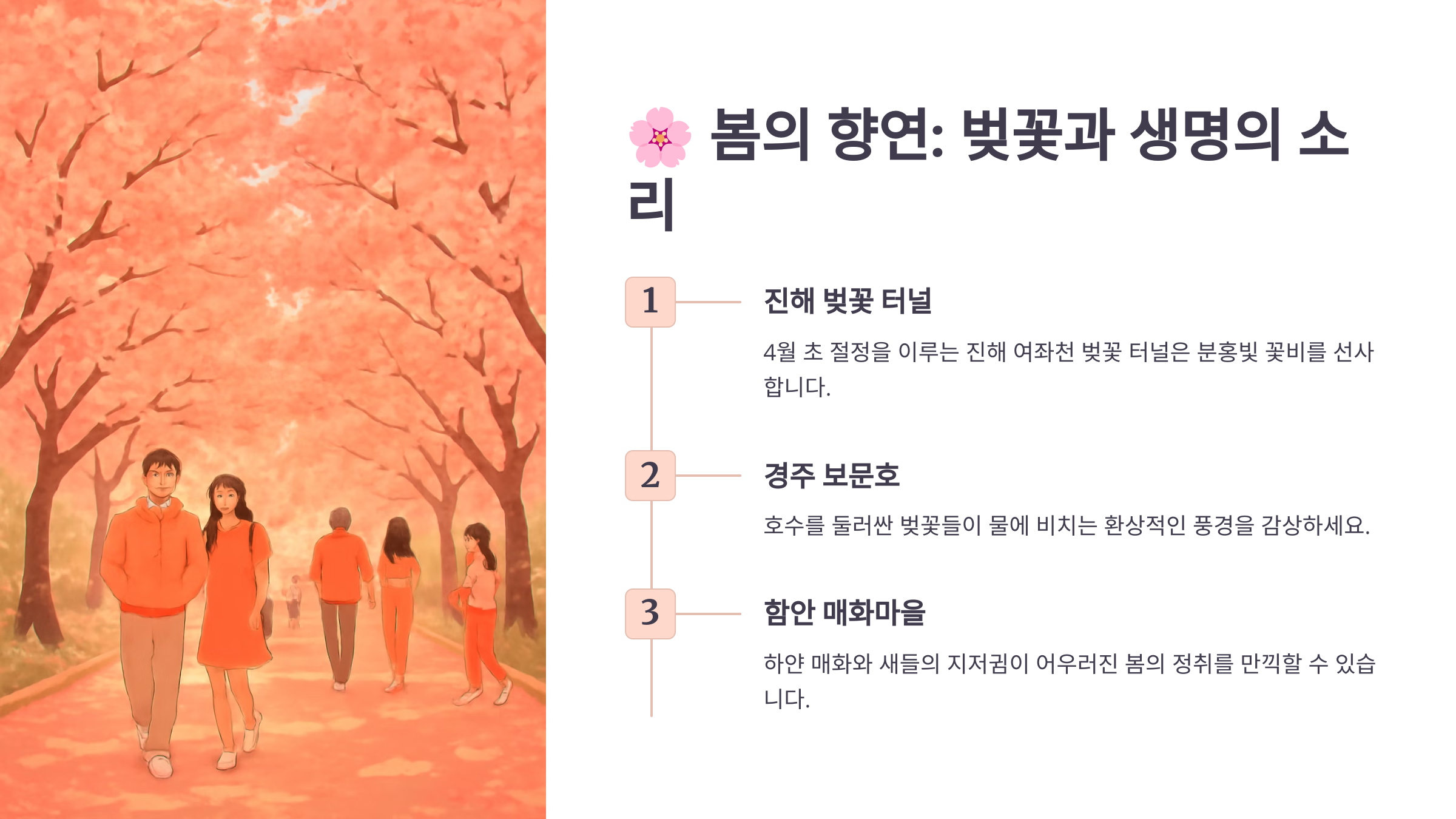 봄이 오면 온 산과 들에 생명이 피어나요. 특히 3~4월은 전국 곳곳이 벚꽃으로 물드는 시기인데요, 진해, 경주, 여의도, 섬진강 벚꽃길은 매년 이 시기를 기다리는 사람들로 북적여요.
