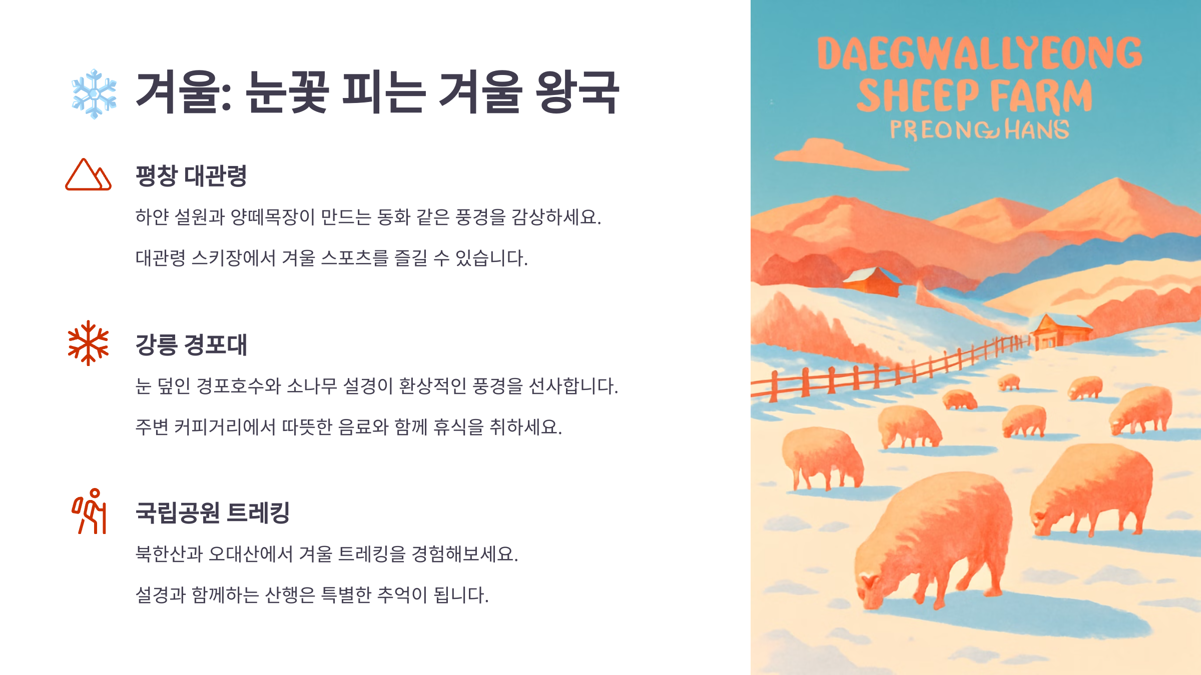 강원도 평창은 겨울 하면 빠질 수 없는 대표 여행지예요. 대관령 양떼목장은 눈으로 덮인 초원이 정말 아름답고, 알펜시아 스키장은 레저와 숙박이 모두 가능한 곳으로 많은 사랑을 받아요.