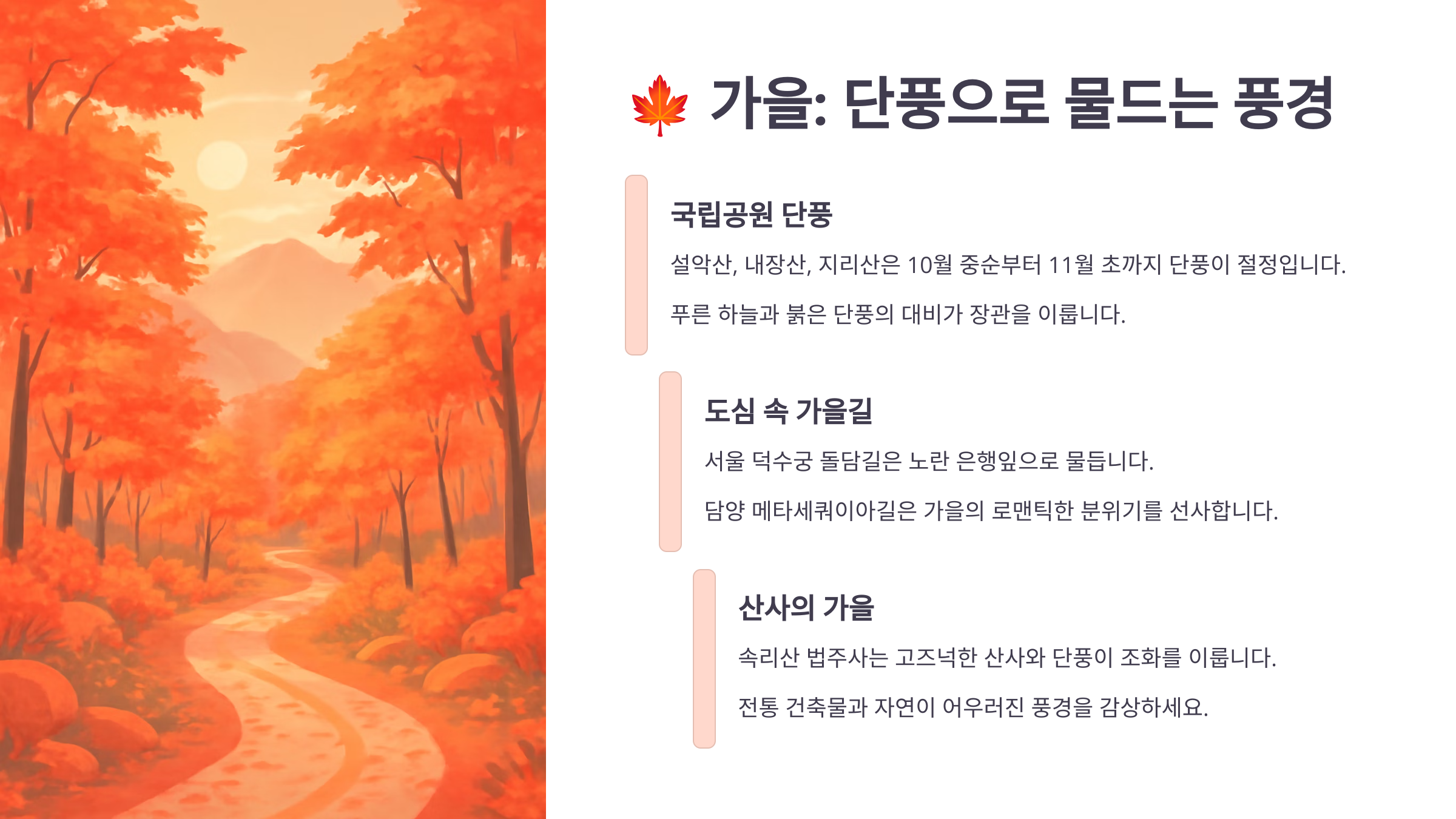 가을은 색의 계절이에요. 붉고 노란 단풍이 산과 들을 물들이며, 햇빛과 바람마저도 온화해지는 느낌이죠. 걷기 좋은 계절이라 산책로, 트레킹 코스가 특히 주목받아요.