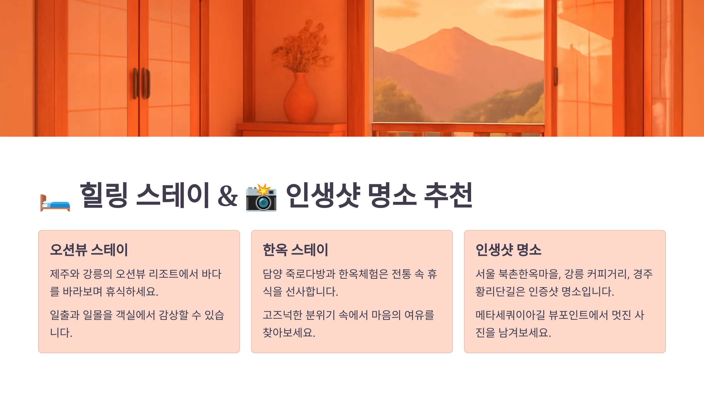 여행 중 진짜 중요한 건 ‘잘 쉬는 시간’이에요. 아무리 좋은 풍경도 피곤하면 감흥이 떨어지잖아요. 그래서 요즘은 ‘쉼’에 집중한 힐링 숙소가 인기를 끌고 있어요. 사계절 내내 감성 넘치는 숙소에서의 하루는 진짜 여행의 완성이죠.