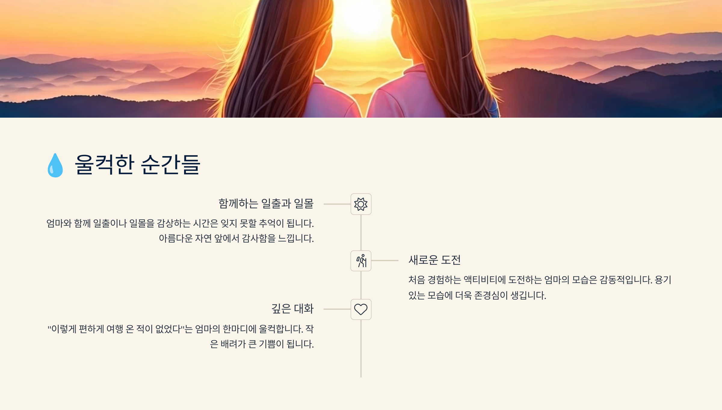 엄마랑 여행을 하다 보면 예상치 못한 순간에 울컥하게 되는 경우가 있어요. 평소엔 무심코 지나쳤던 말, 잊고 있던 기억들이 낯선 공간에서 터져 나오거든요. 💭