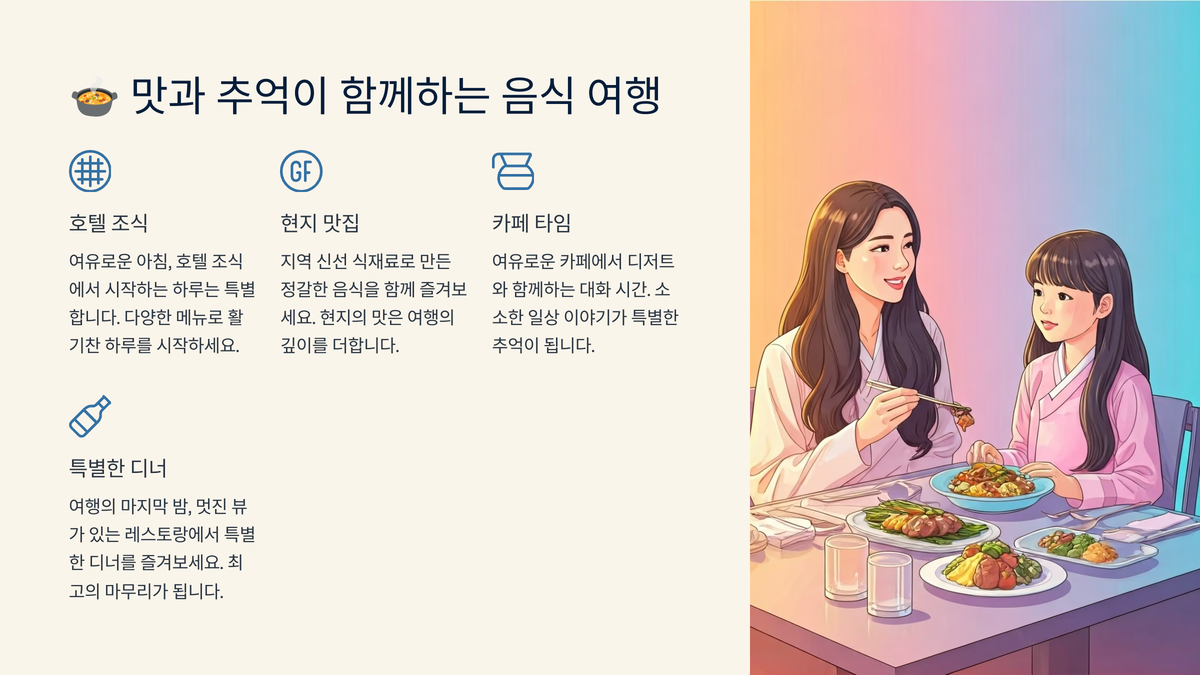 엄마와의 여행에서 빼놓을 수 없는 건 바로 ‘맛있는 음식’이에요. 평소 집밥만 드시던 엄마에게는 여행지의 새로운 맛이 큰 즐거움이 돼요. 그 한 끼가 특별한 기억으로 오래 남기도 하죠. 🍽️
