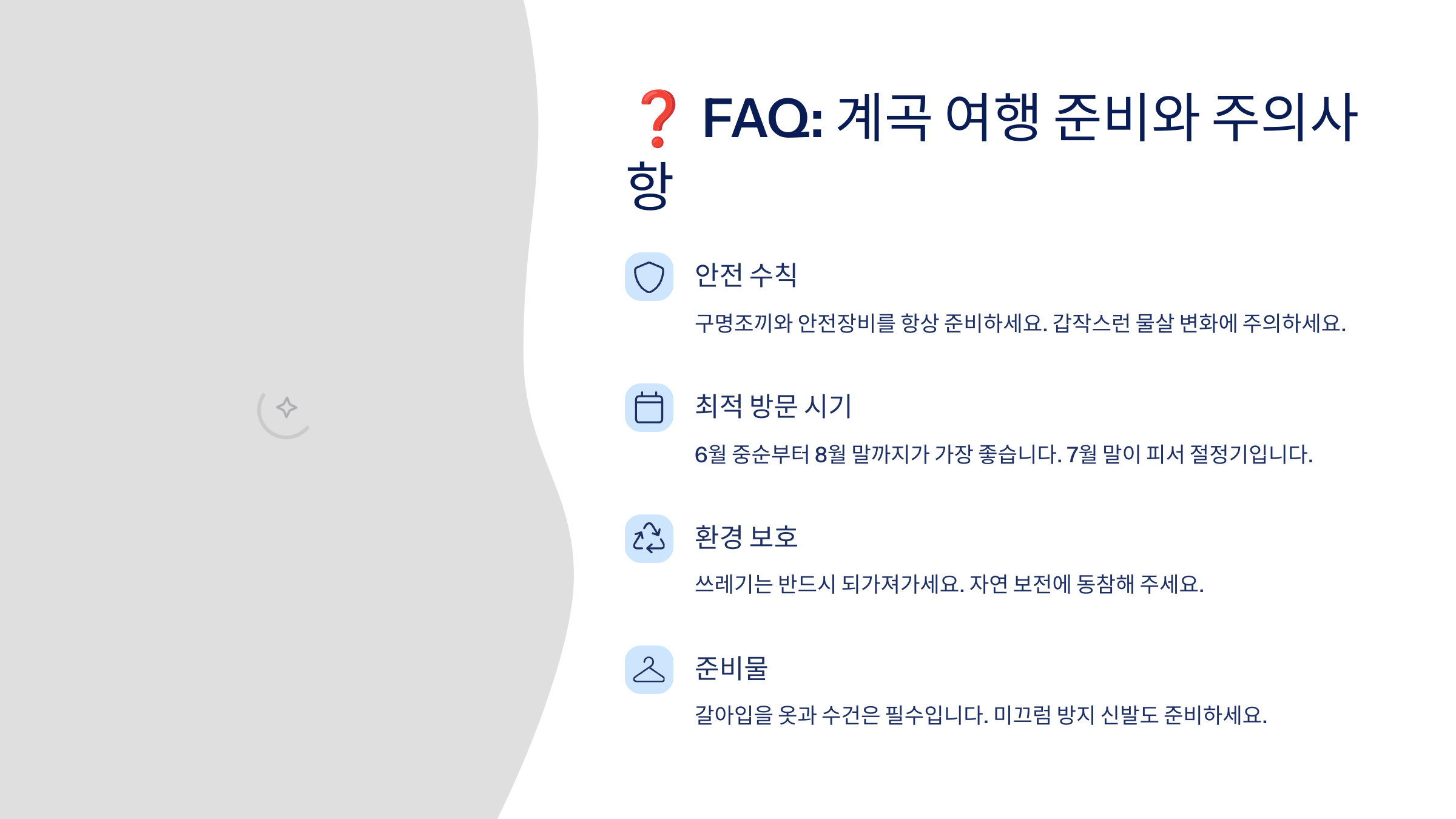 이제 마지막으로, 계곡 여행을 준비하며 자주 묻는 질문들을 FAQ 형식으로 정리해드릴게요! 안전하게, 알차게 계곡 여행을 즐기려면 꼭 참고해보세요 🙋♀️