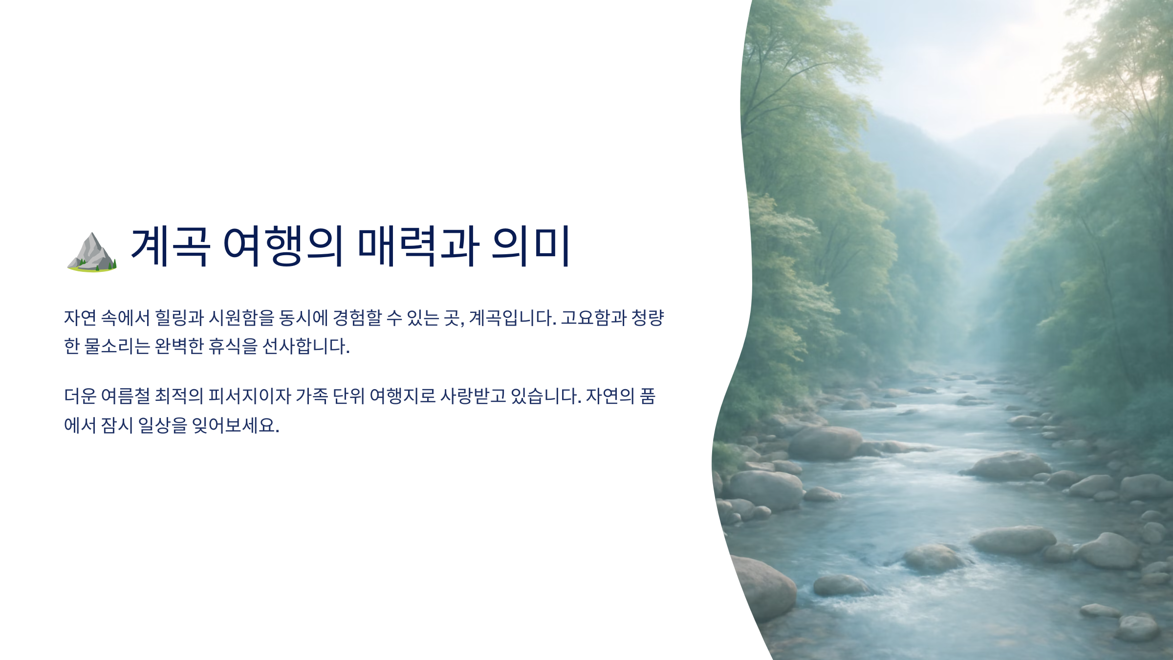 내가 생각했을 때, 계곡 여행은 단순한 외출이 아니라 내면의 휴식을 위한 시간 같아요. 자연이 건네는 위로는 언제나 조용하지만 깊이 와닿거든요. 더운 여름, 마음까지 시원해지는 여행을 원한다면 계곡으로 떠나는 게 최고의 선택이에요 🌳