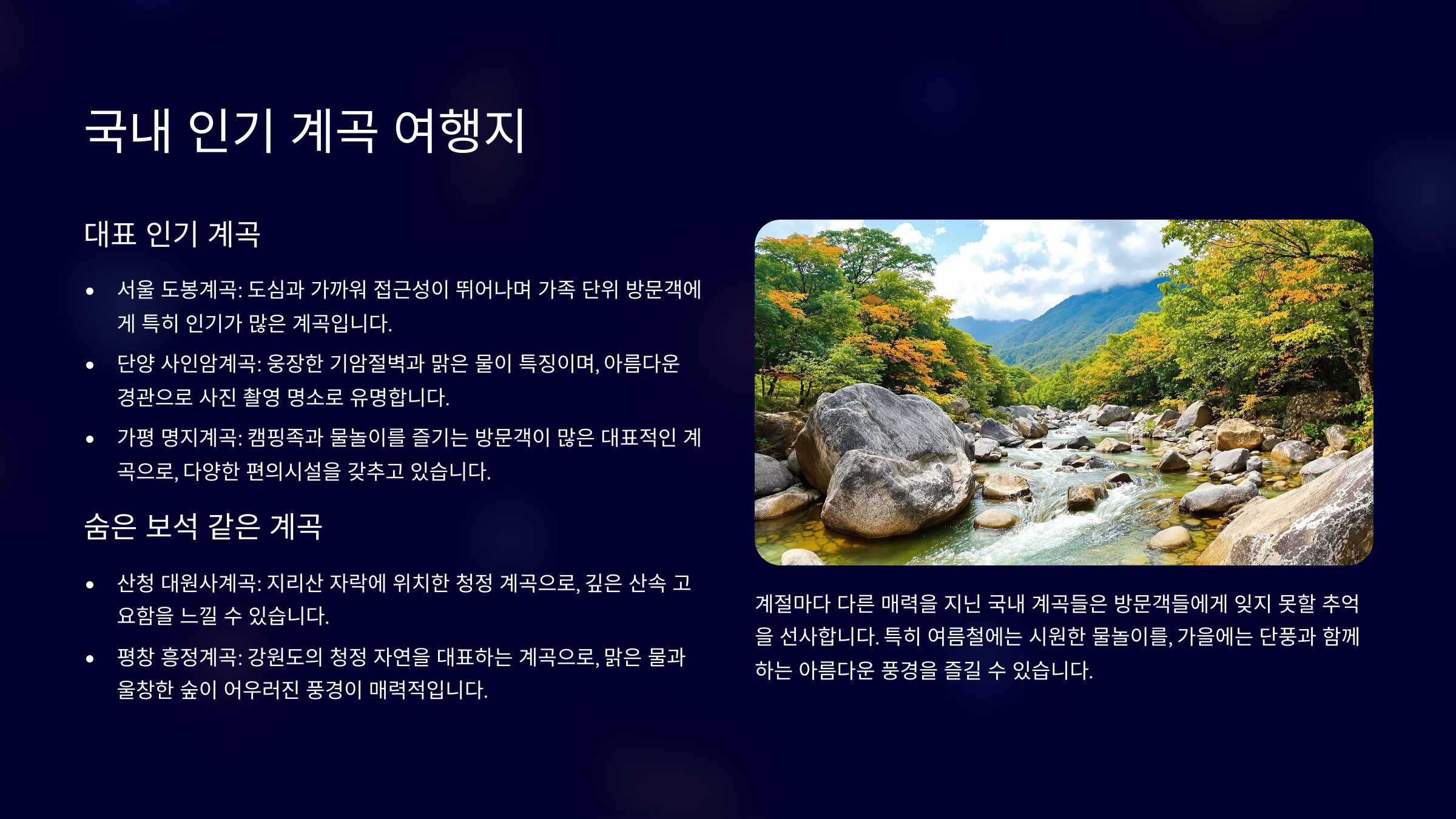 우리나라에는 사계절 내내 아름다운 자연을 간직한 계곡이 많아요. 특히 여름철에는 무더위를 식히기 좋은 명소들이 전국 각지에 흩어져 있어서, 누구나 가까운 곳에서 자연을 즐길 수 있답니다. 오늘은 꼭 한번 가봐야 할 인기 계곡들을 지역별로 소개해볼게요. 🗺️
