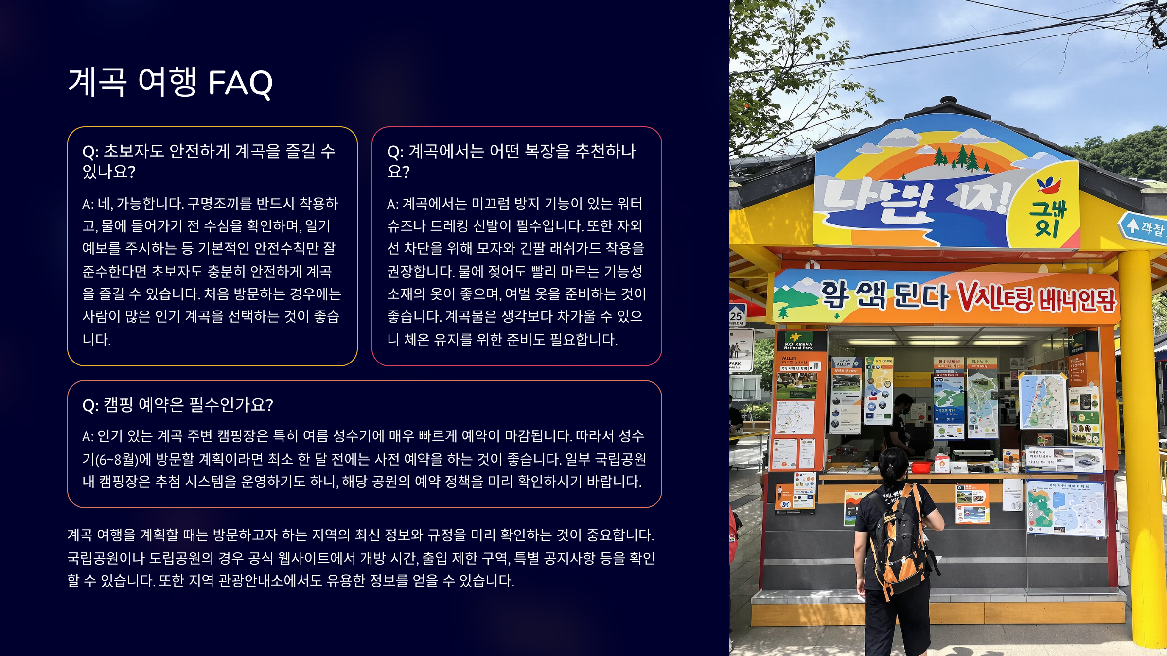 A7. 대부분의 인기 계곡에는 공영 또는 사설 주차장이 있어요. 단, 성수기에는 조기 만차가 많으니 아침 일찍 도착하는 걸 추천해요.
