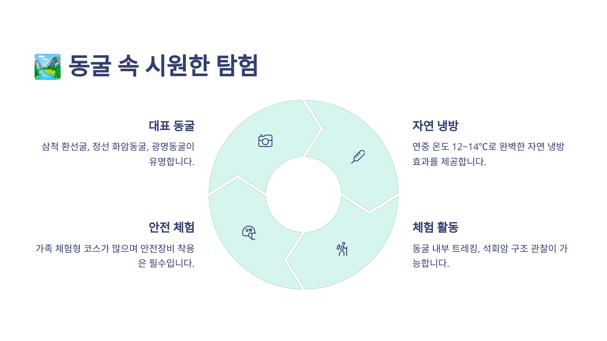 동굴 여행을 떠나기 전에, 동굴의 특성상 미끄럼 방지를 위해 편한 신발을 신는 게 좋아요. 자연의 조명과 시원한 공기를 가득 느끼며, 동굴의 신비로운 풍경을 하나씩 만나보면 잊을 수 없는 여름 여행이 될 거예요. 🏞