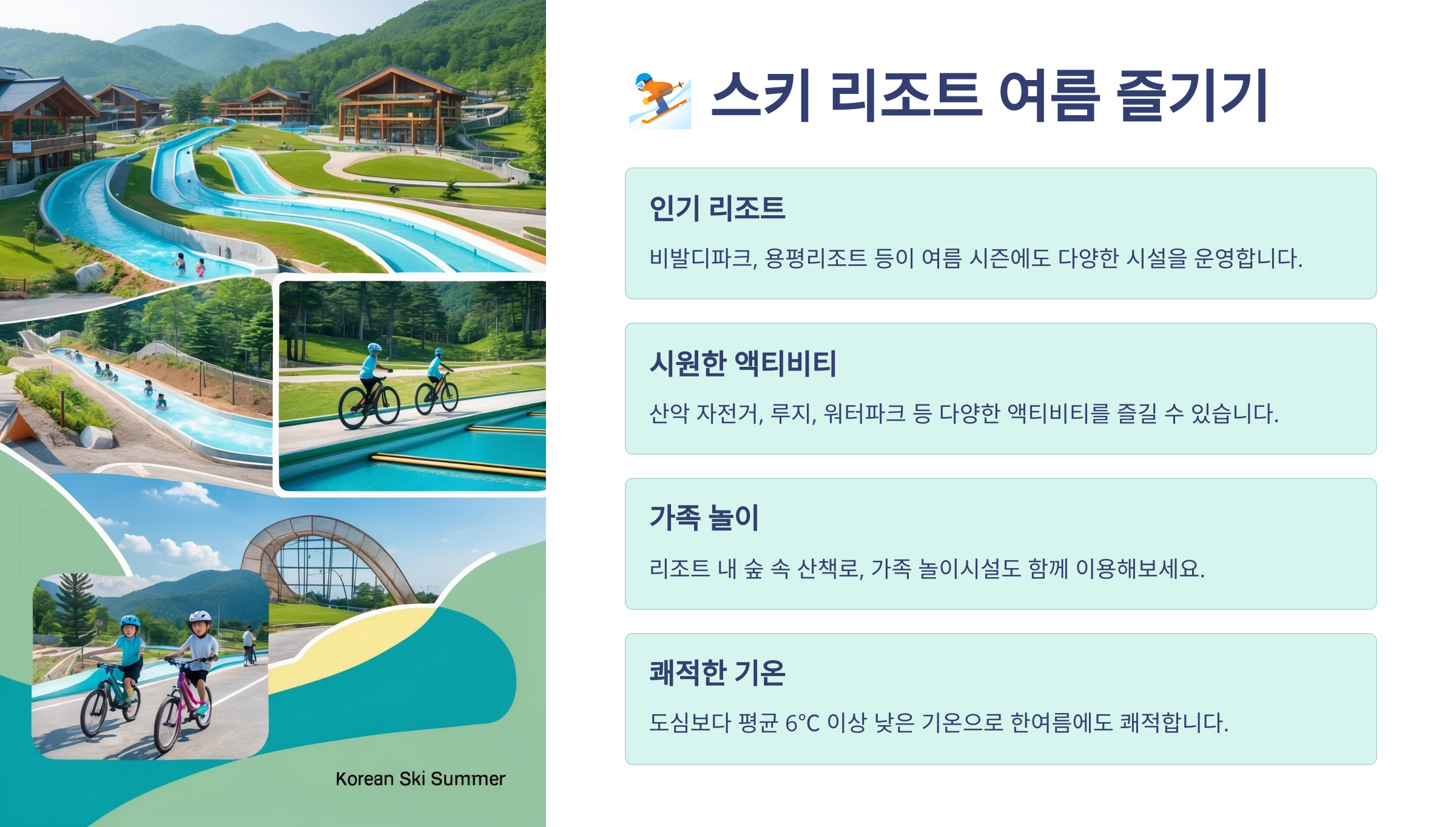 스키 리조트의 여름은 한여름에도 상쾌하고 즐거운 피서를 보낼 수 있는 최고의 장소예요. 각 리조트마다 체험할 수 있는 활동이 다르니까, 가족이나 친구들과 함께 색다른 여름 휴가를 계획해봐요. 🌄