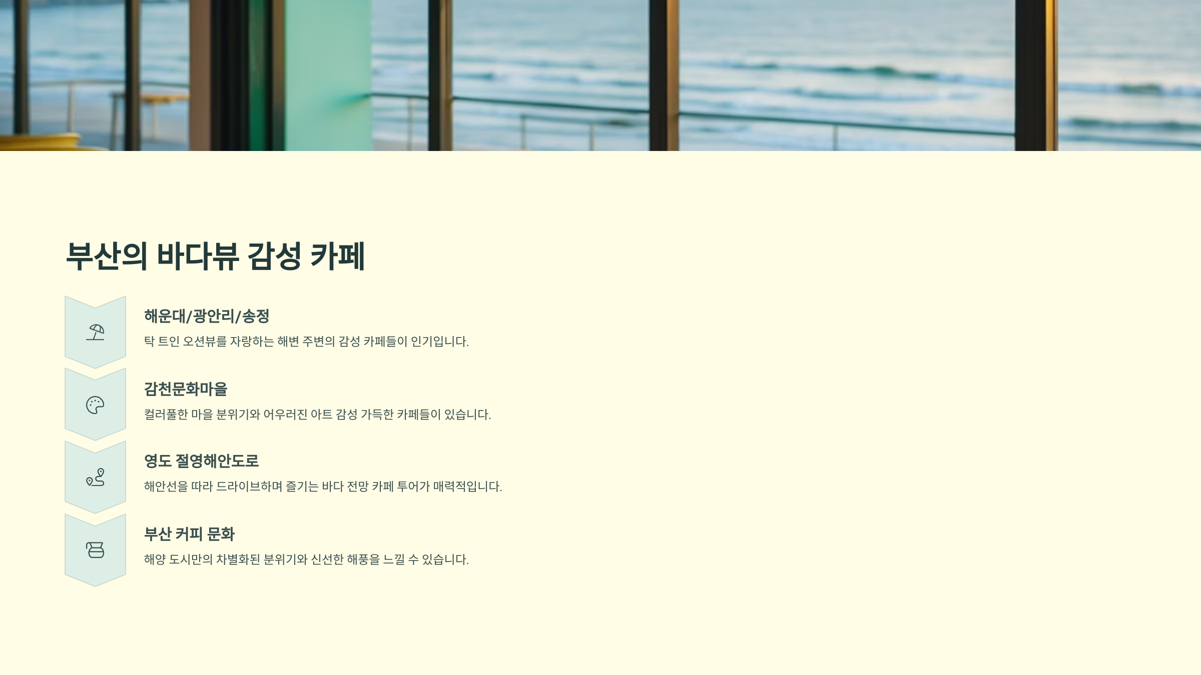특히 해운대, 광안리, 송정 같은 바닷가 지역에는 시원한 바닷바람과 함께 여유를 즐길 수 있는 카페들이 가득하답니다.