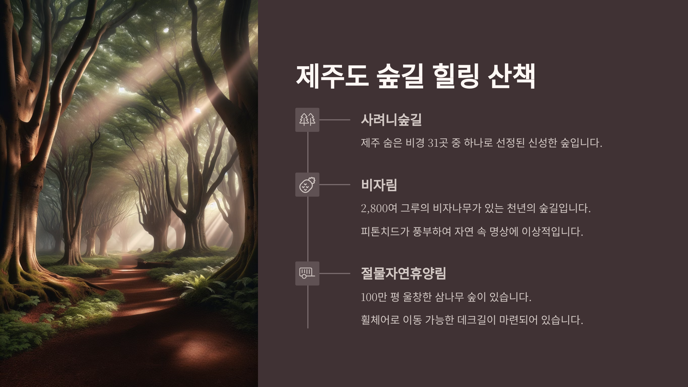 마음이 지칠 때, 복잡한 도시에서 벗어나 자연의 품에 안겨보세요. 제주도 숲길은 혼자만의 시간을 보내기에도, 나를 다시 사랑하게 되기에도 정말 좋은 장소랍니다. 🌲