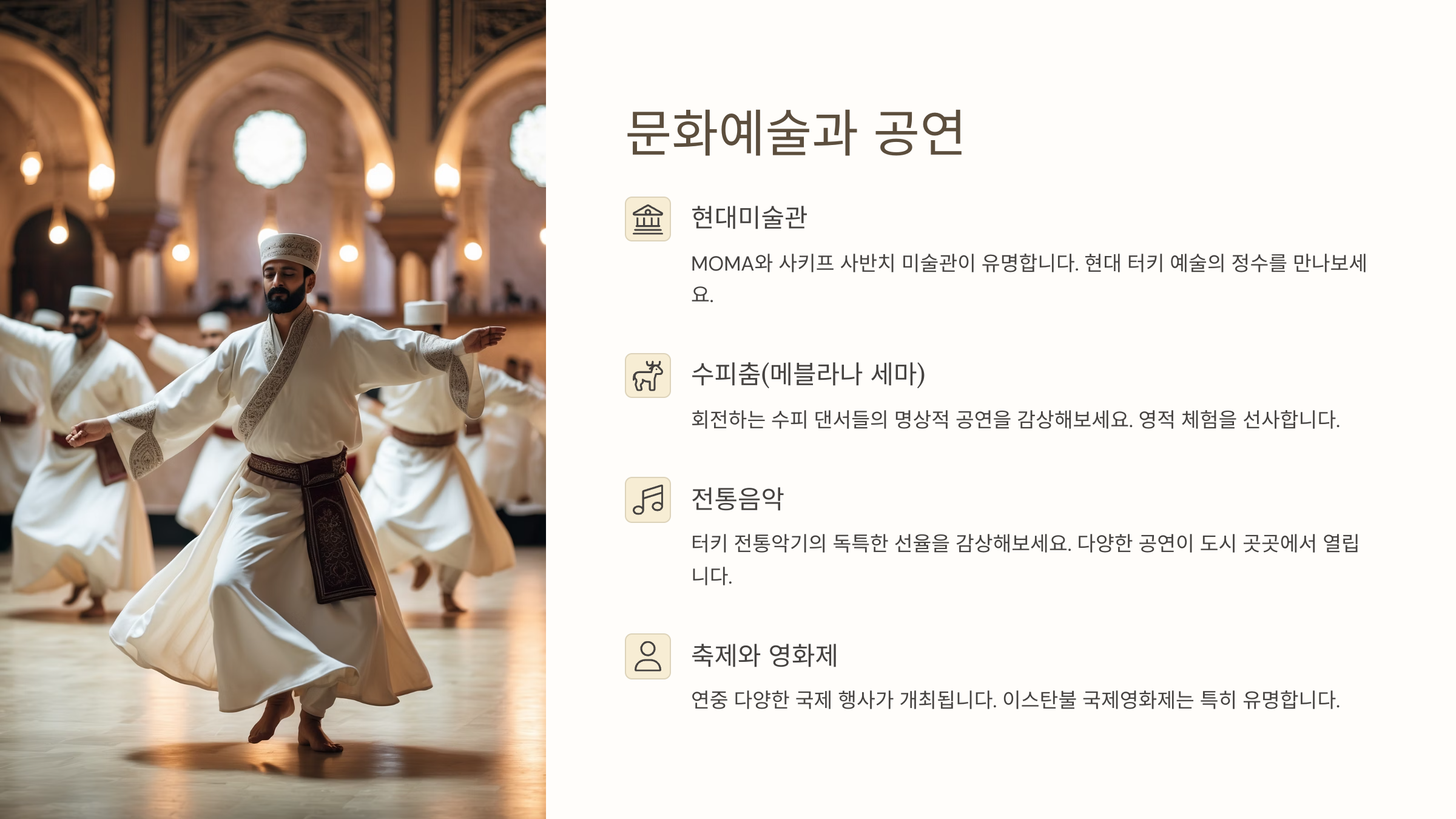 이제 이스탄불에서 즐길 수 있는 문화예술과 공연 이야기도 이어서 소개해줄게요. 기대해도 좋아요!