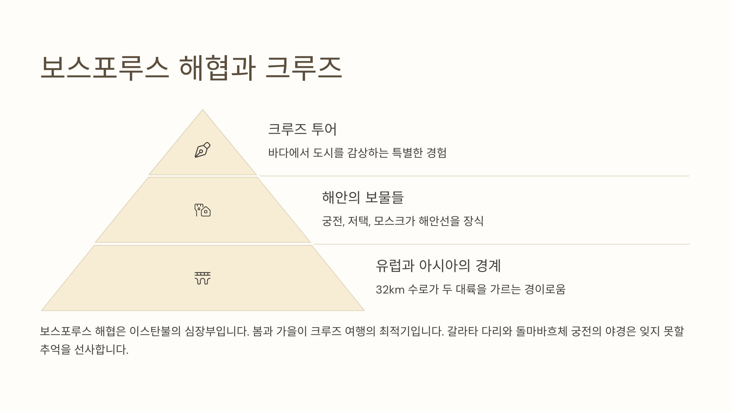 이스탄불을 더욱 특별하게 만들어주는 요소 중 하나는 바로 보스포루스 해협이에요. 이 해협은 유럽과 아시아 대륙을 가르는 천혜의 수로로, 옛날부터 무역과 문화의 중심지 역할을 해왔어요. 물길을 따라 펼쳐진 도시 풍경은 그림 같은 장면을 연출해요. 크루즈를 타면 바람을 맞으며 도시의 두 얼굴, 동서양의 조화를 생생하게 느낄 수 있답니다.