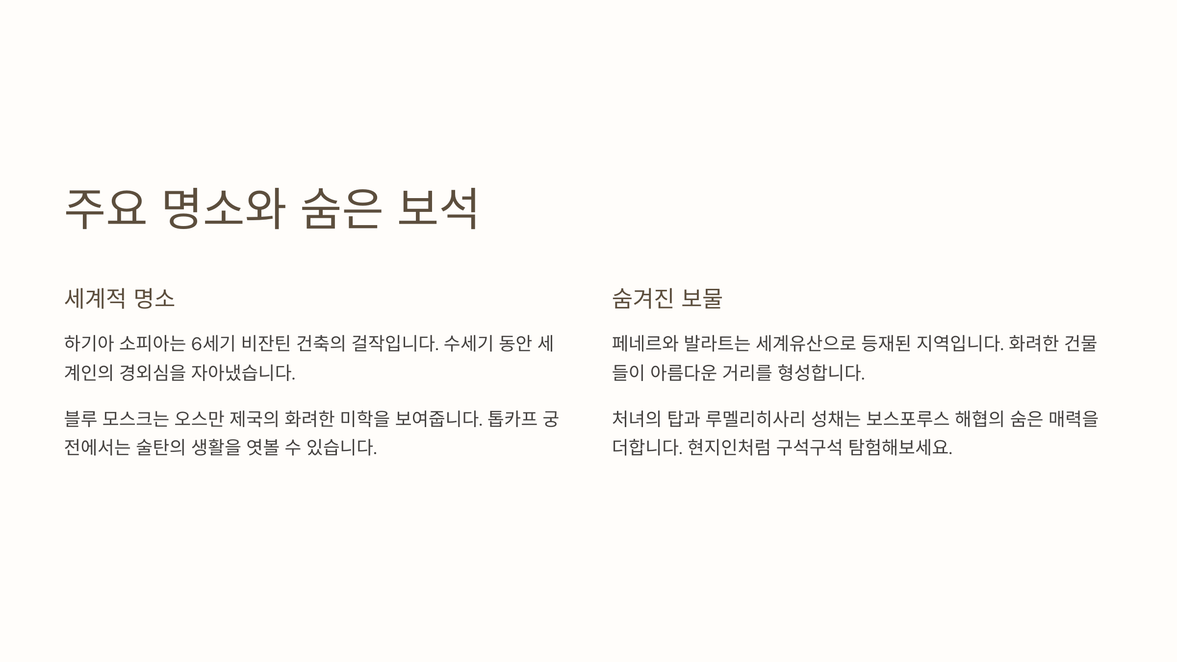다음 문단에서는 이스탄불의 주요 명소와 숨은 보석들을 이어서 소개할게요. 기대해도 좋아요!