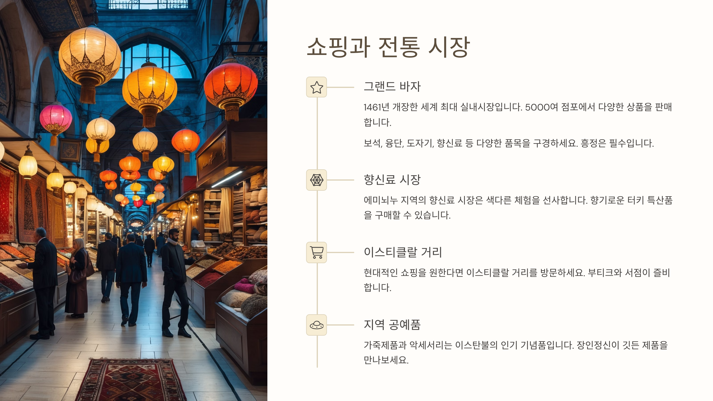 이곳들은 단순한 쇼핑을 넘어서 현지인의 삶을 가까이에서 느낄 수 있는 기회이기도 해요. 물건을 살 때 상인들과의 대화에서 터키 사람들의 따뜻한 환대도 함께 느낄 수 있답니다.