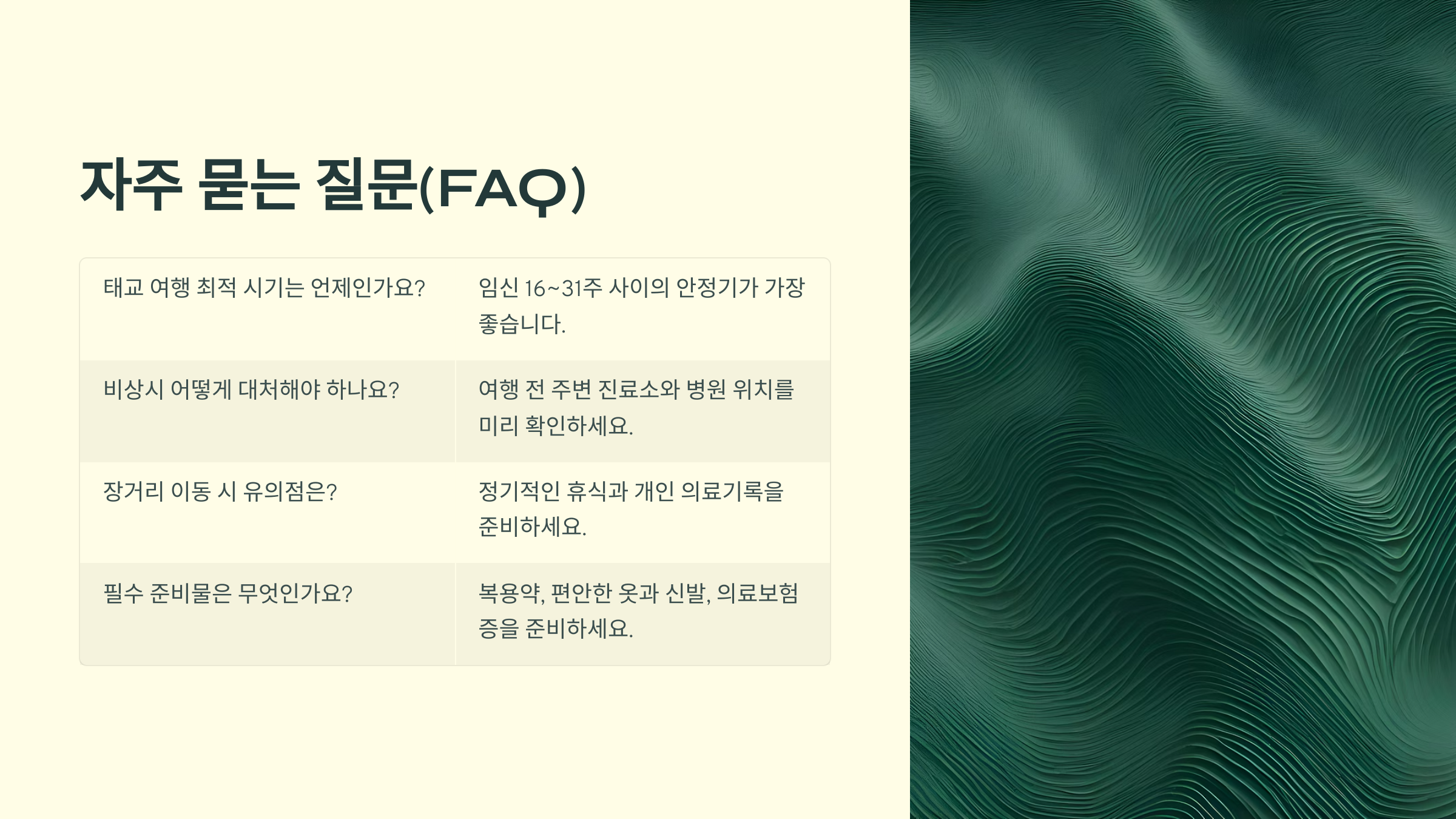 편안한 마음으로 계획을 세우는 것만으로도 태교의 시작이에요. 여행 전 건강 체크와 간단한 준비만 해도, 몸과 마음이 한결 가벼워질 거예요. 🌸