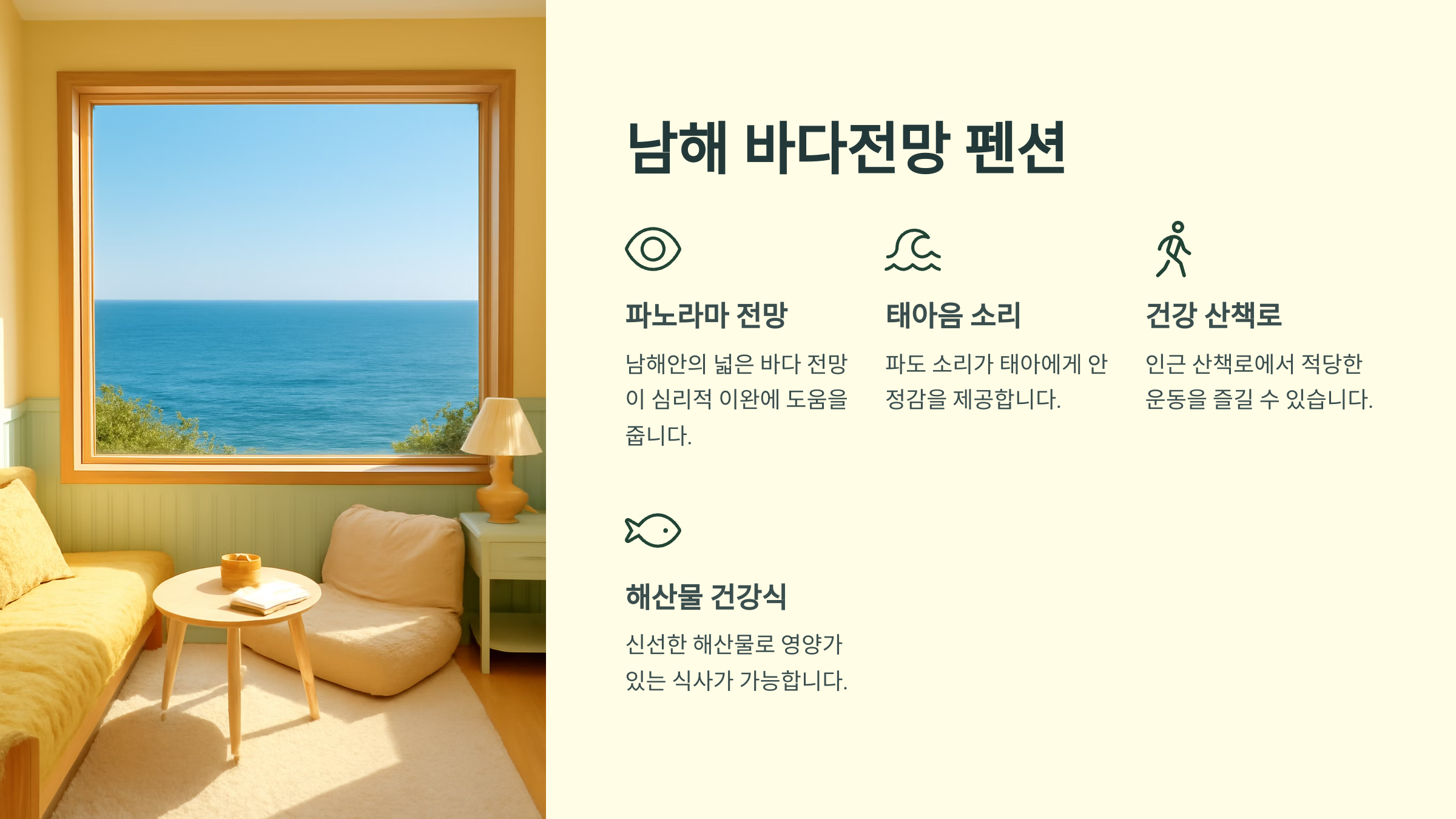 남해는 바다와 산이 어우러진 조용한 지역으로, 임산부에게 최고의 자연 태교지를 제공해요. 유명 관광지보다는 다소 외진 바닷가 마을에 위치한 프라이빗 펜션이 요즘 인기를 끌고 있어요. 전 객실 오션뷰, 단독 객실 구조로 조용하게 머물 수 있어요.