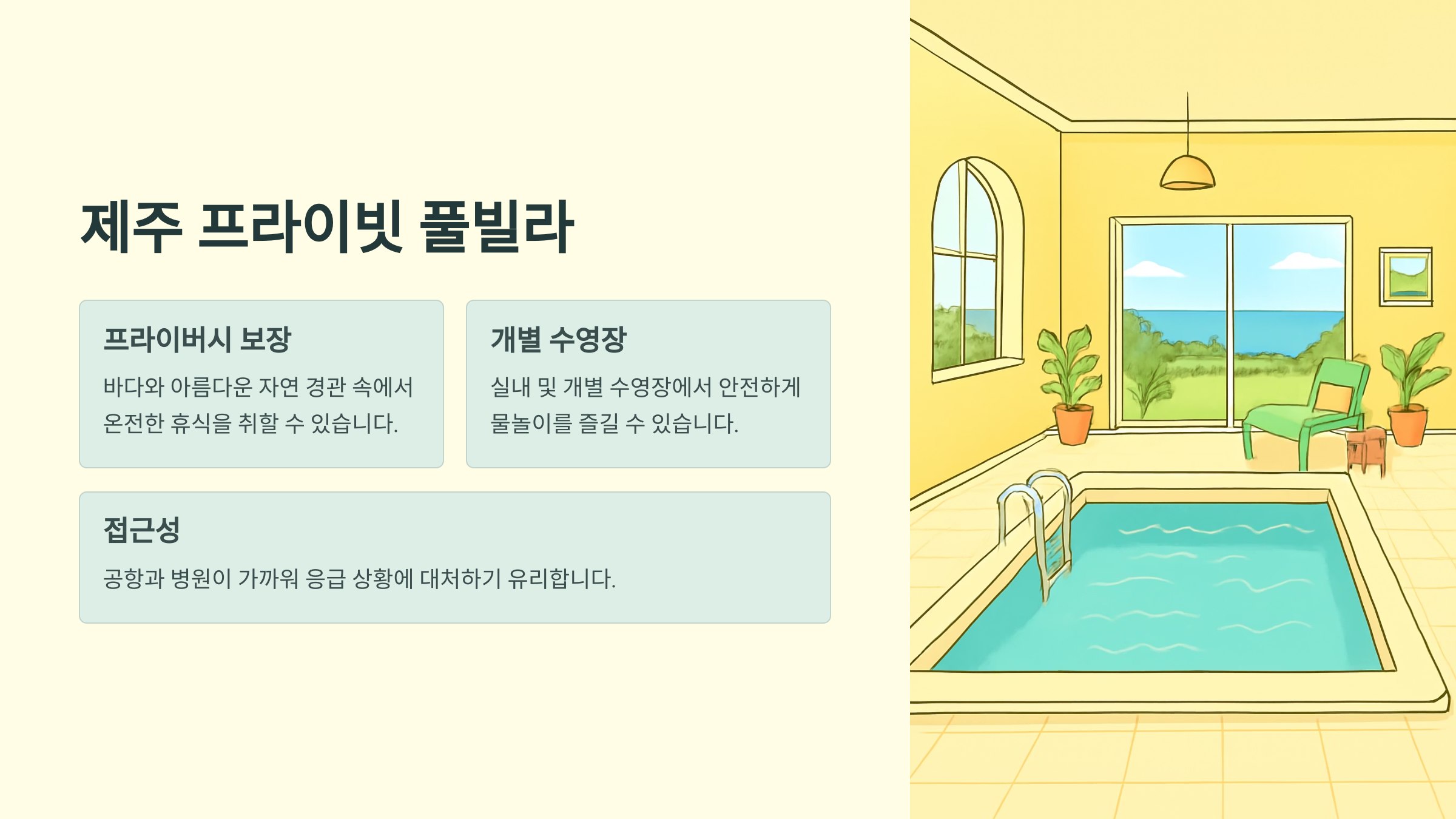 제주는 임산부에게 특히 사랑받는 여행지예요. 공항에서 차로 30분 거리에 위치한 서귀포나 애월 지역에는 프라이빗 풀빌라가 많아서, 조용히 쉴 수 있답니다. 독립된 공간에서 바람 소리와 파도 소리를 들으며 하루를 보내는 건 정말 특별해요.