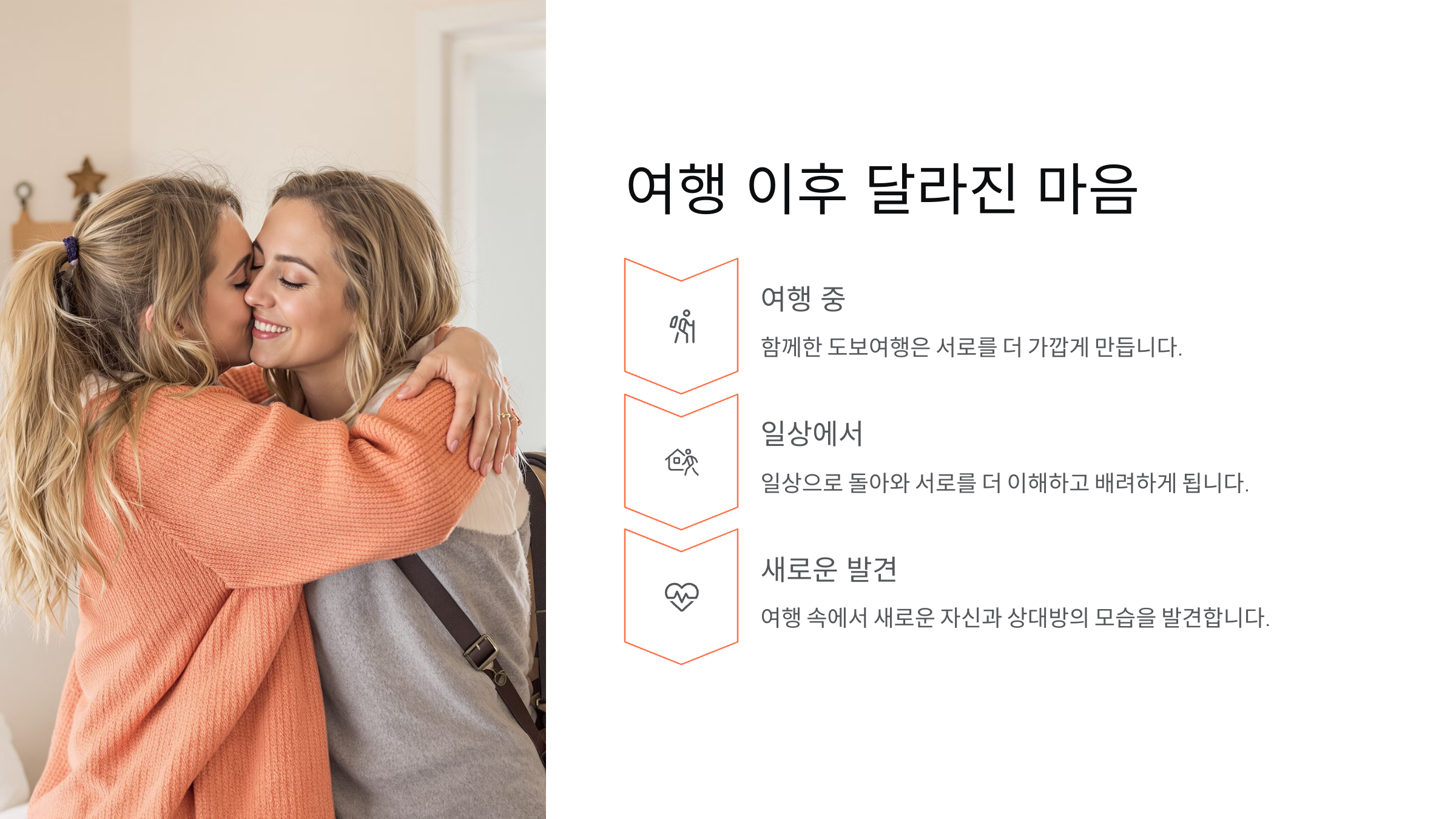 언제나 함께 있어 당연하게 느껴졌던 사이가, 여행을 통해 새롭게 보이고, 다시 고마움을 느끼게 되는 순간도 자주 있어요. 그런 감정이 쌓여서 돌아온 후에도 더 가까워지는 계기가 되죠.