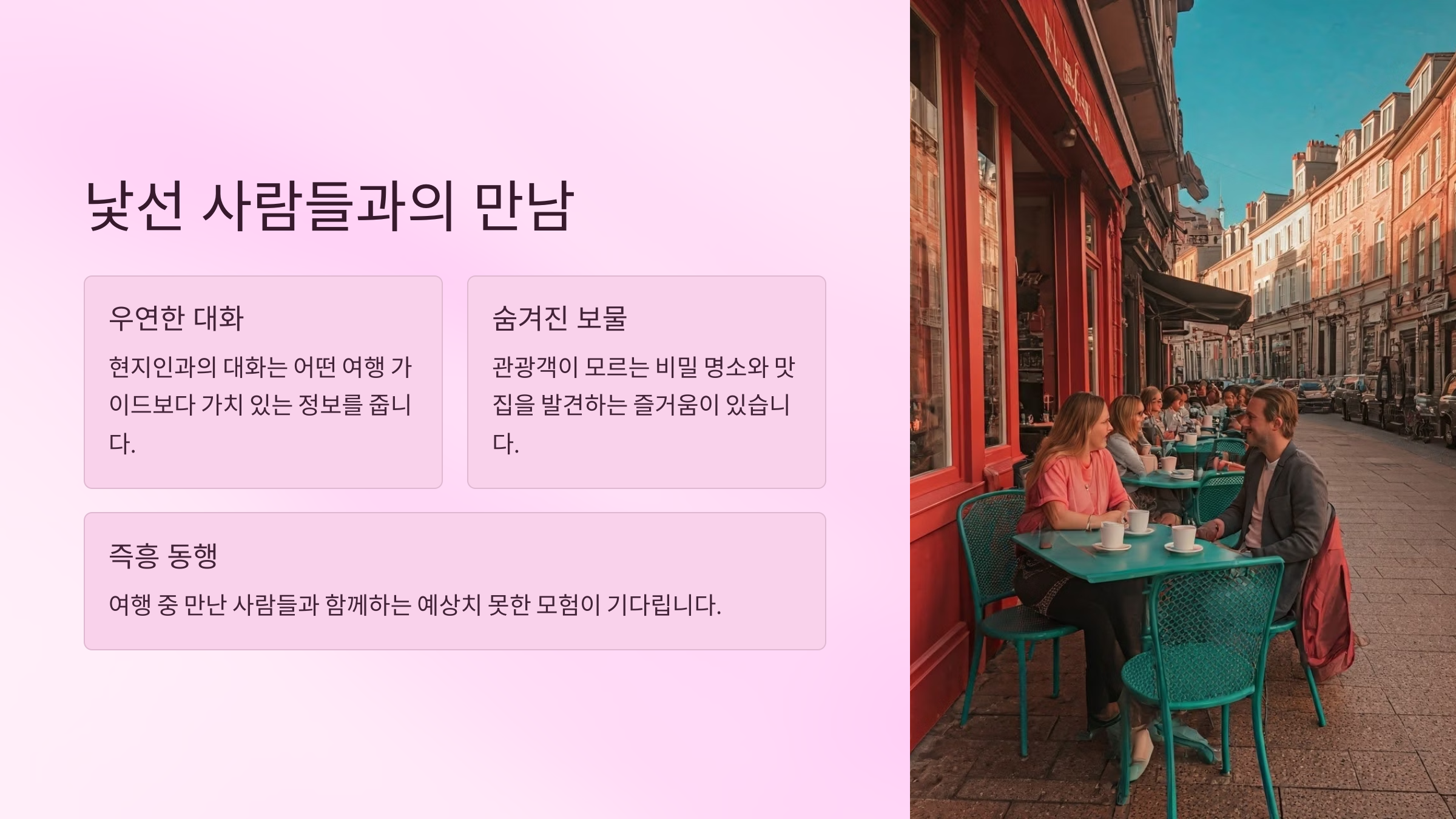 여행의 묘미는 낯선 사람들과의 만남이에요. 우연히 마주친 사람들의 말 한마디가 큰 울림이 되더라고요.