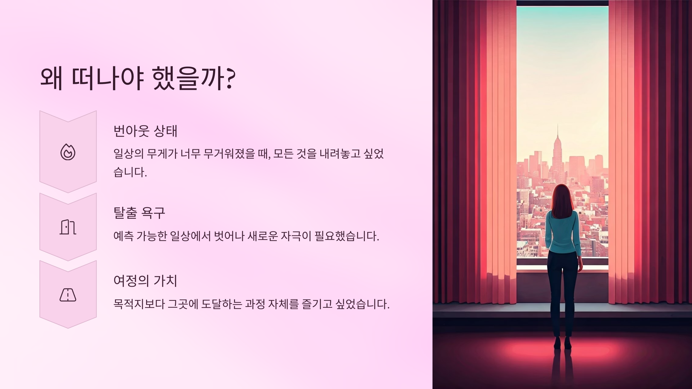 떠나기 전엔 늘 바쁘게 살아야 한다고 믿었어요. 뭔가 해야만 가치 있는 줄 알았어요.