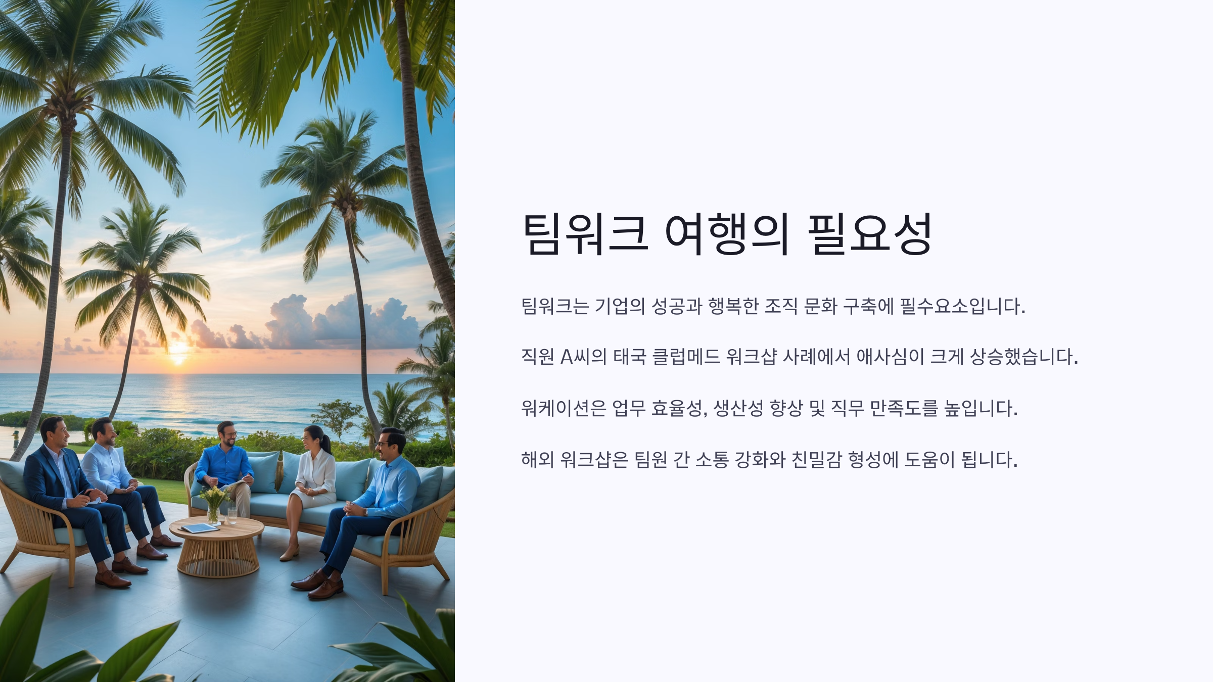 이런 여행은 단순히 쉬러 가는 게 아니라, 새로운 환경에서 동료들과 어울리며 서로의 성격과 장점을 더 깊이 이해하게 해줘요. 회사에서 느끼는 긴장감과 경쟁심을 벗어나면 자연스럽게 소통이 많아지고, 서로를 응원하게 되죠. 결과적으로 회사의 분위기도 한층 더 따뜻해지고, 업무에도 긍정적인 효과를 줘요.