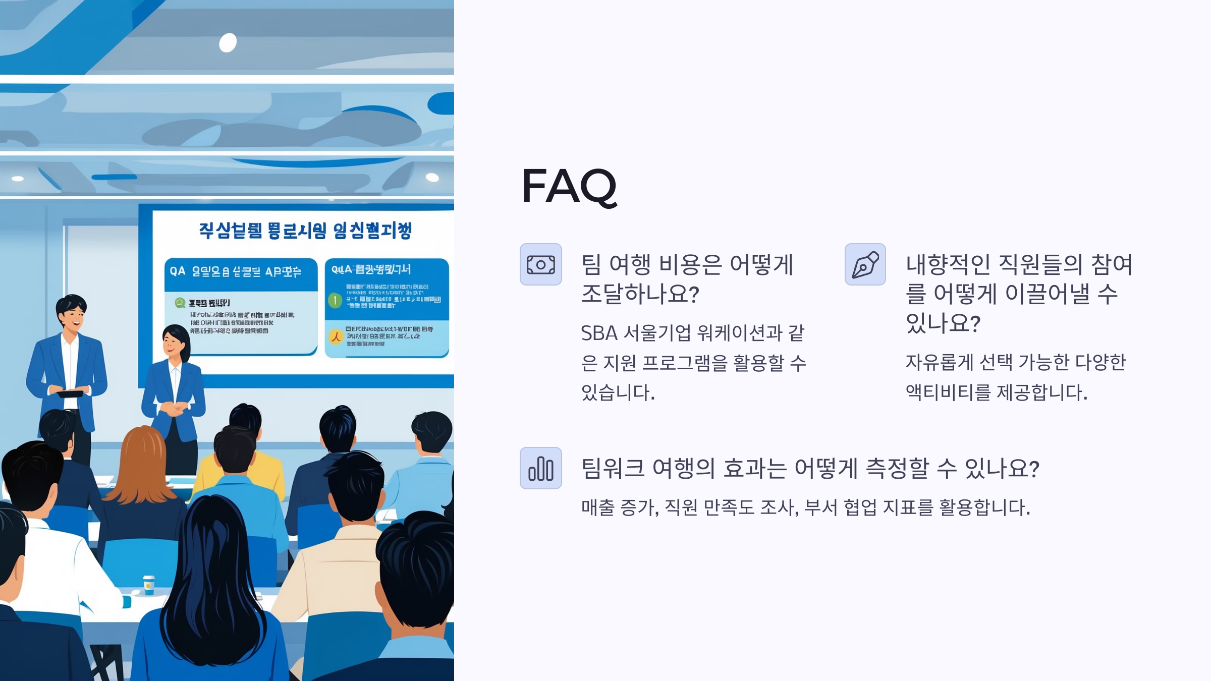 또한 직원들의 의견을 꼭 반영해야 해요. 모두가 원하는 활동을 찾아야 즐거움이 배가되거든요. 간단한 설문을 통해 “어떤 액티비티가 좋을까?”, “무엇을 기대하나?”를 물어보면 의견을 쉽게 모을 수 있답니다.