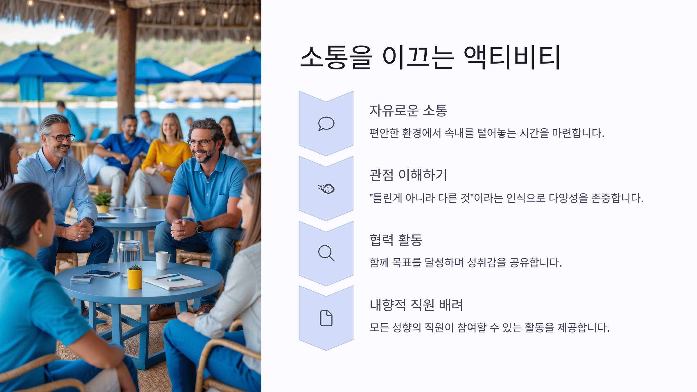 이처럼 소통을 이끄는 액티비티는 직원들이 자연스럽게 대화를 이어갈 수 있게 해주고, 평소와는 다른 모습을 발견할 수 있는 기회가 돼요. 회사로 돌아와서도 “그때 재밌었지!”라며 이야기꽃을 피울 수 있으니, 소통의 씨앗을 심어주는 귀중한 시간이죠. 🌱