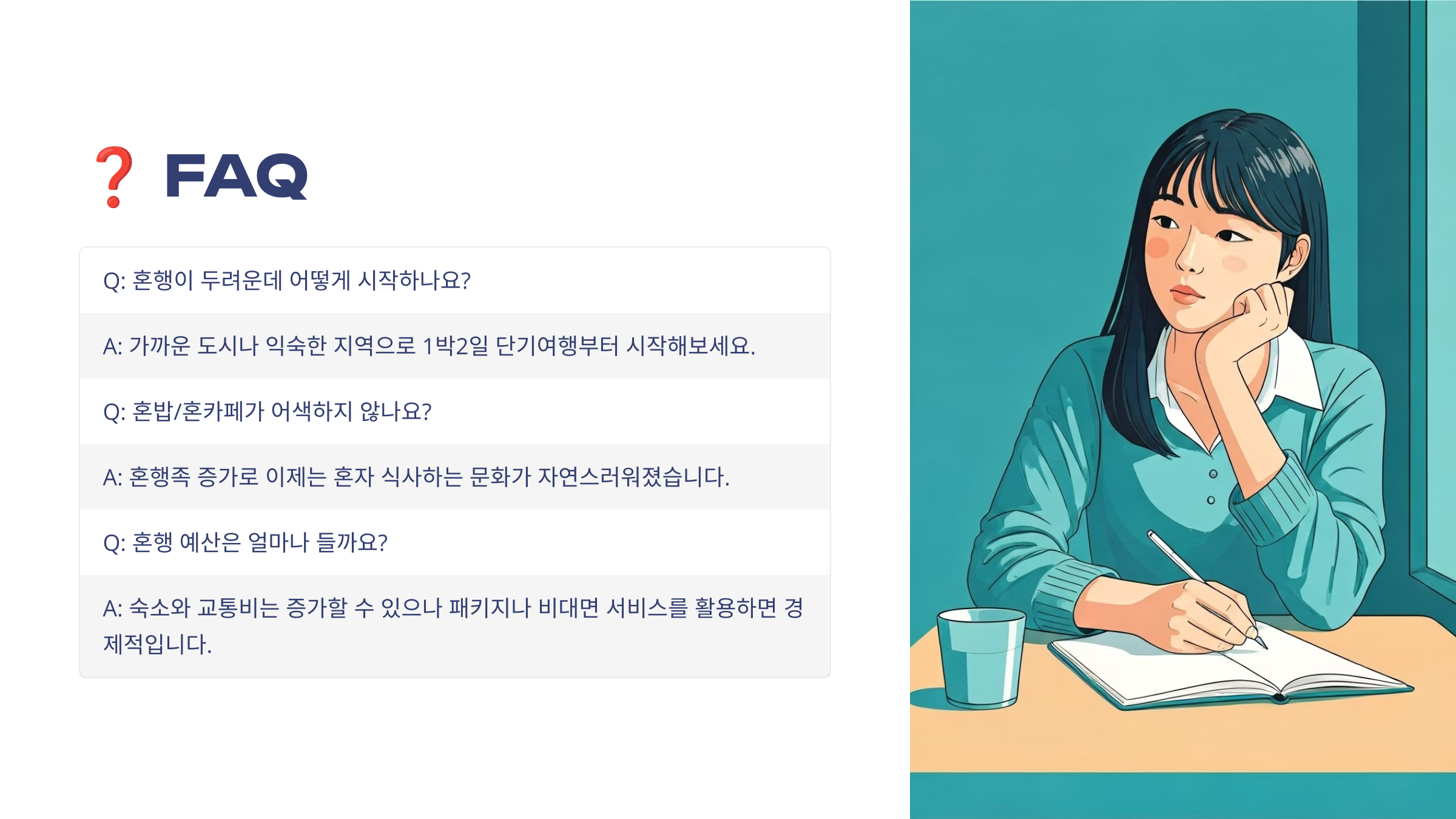 A1. 처음엔 익숙하지 않을 수 있지만, 점점 나와 대화하는 시간이 좋아져요. 오히려 혼자라서 더 자유롭고 감성적인 여행이 된답니다.