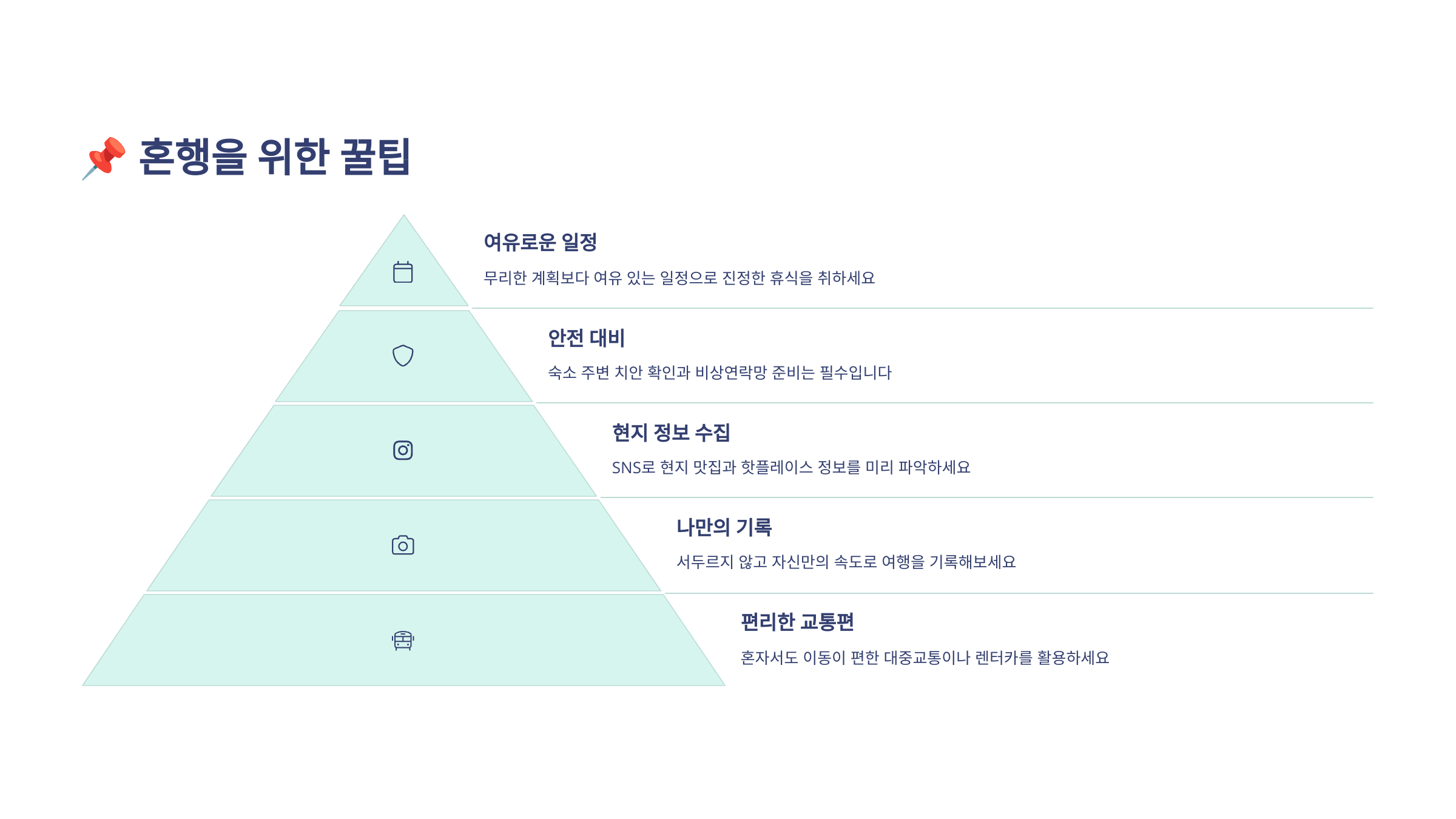 혼행은 자신을 들여다보는 특별한 시간이에요. 나를 챙기고, 나와 대화하며, 내가 어떤 사람인지 자연스럽게 알게 되는 시간이죠. 혼자라는 두려움보다, 혼자라서 가능한 자유를 만끽해보세요.