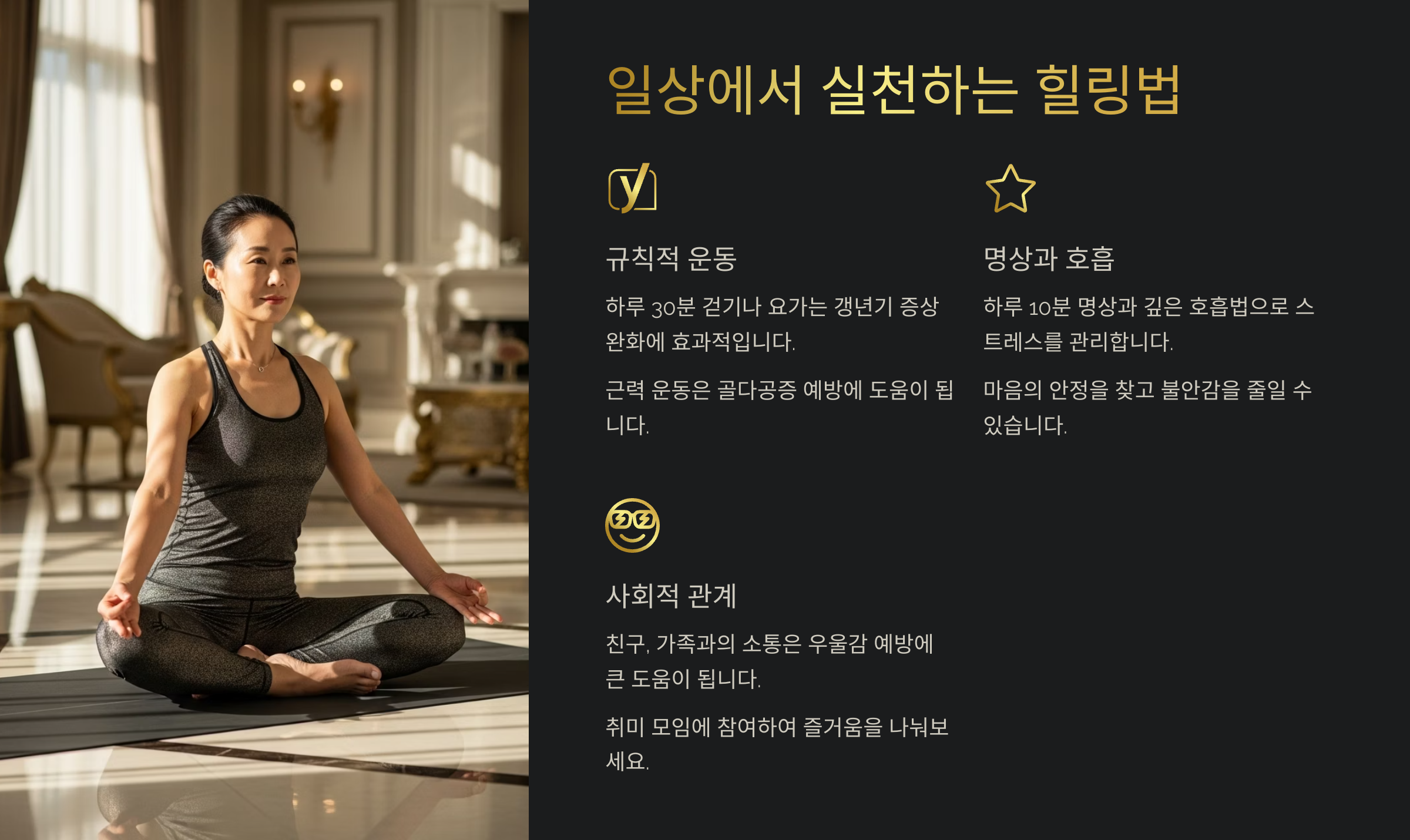 | 명상과 호흡 | 아침 10분 심호흡 명상 | 불안 완화, 마음 안정 |