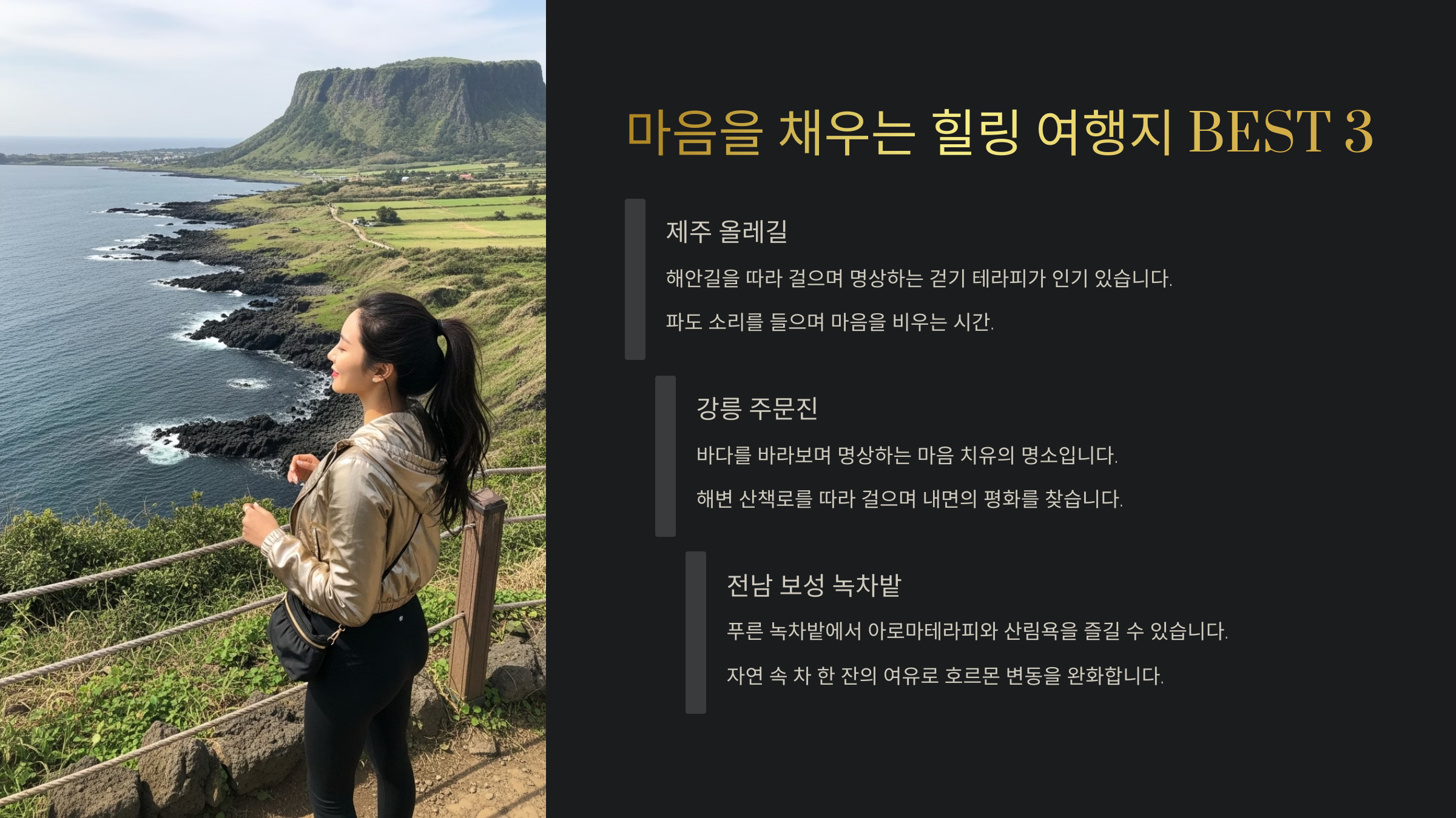 다음 문단에서는 제가 갔다 온 여행지 중에서 꼭 추천하고 싶은 힐링 스팟 3곳을 소개할게요. 각 장소마다 매력이 달라서 고르기 어려웠지만, 진짜 좋았던 곳만 뽑아봤어요!