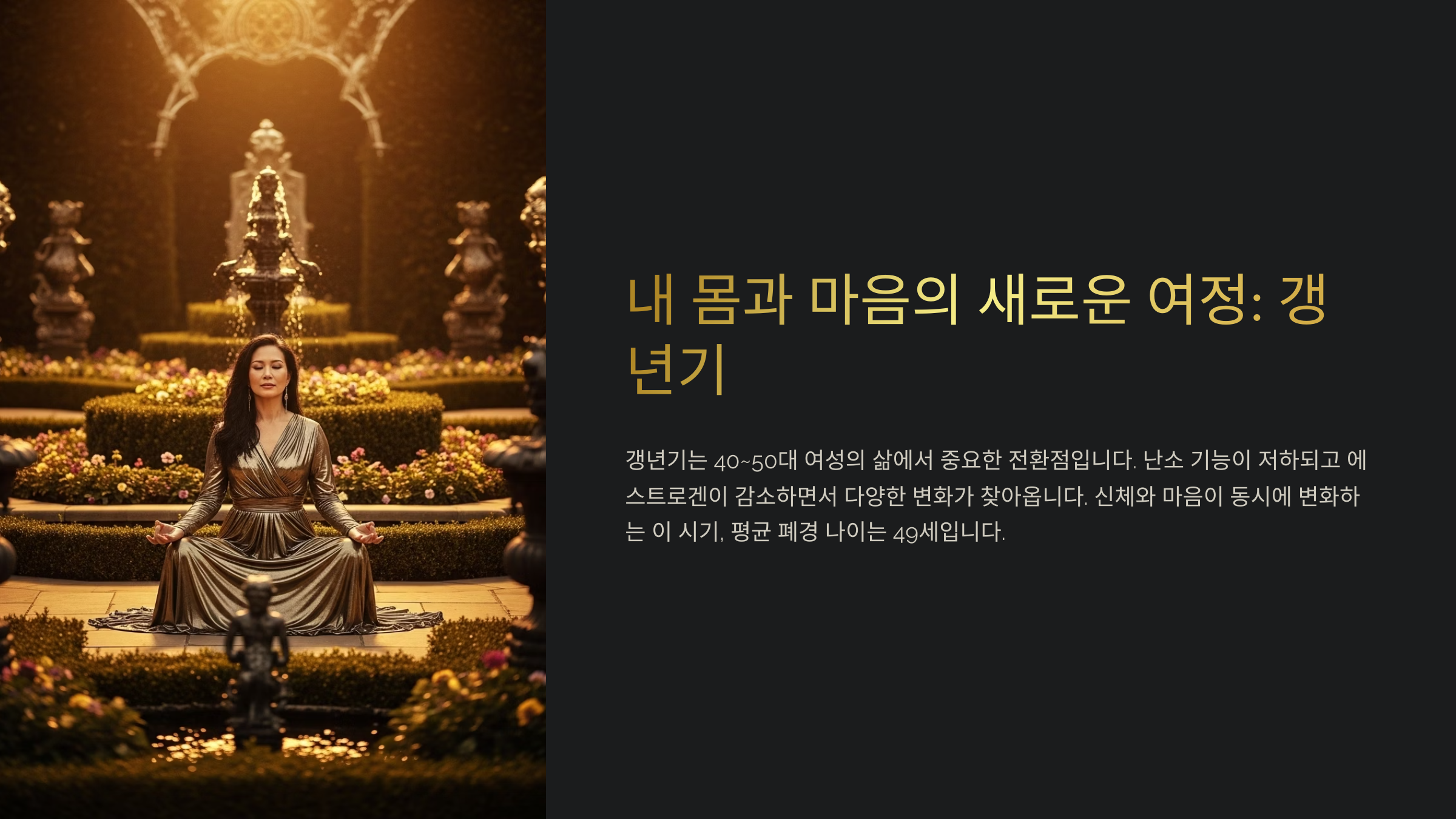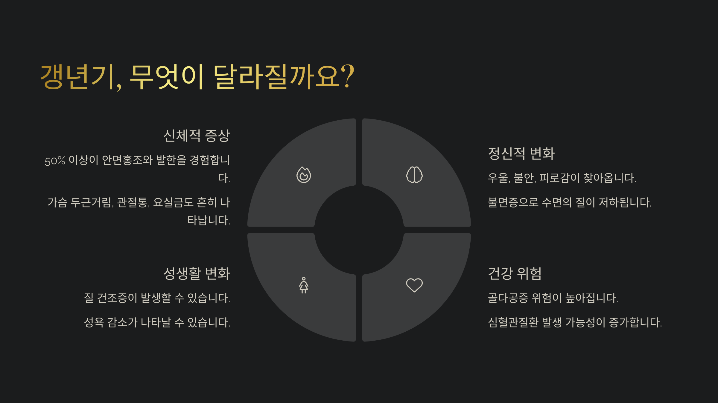 갱년기는 여성이라면 누구나 겪게 되는 자연스러운 생리적 변화예요. 대개 45세~55세 사이에 시작되며, 여성호르몬인 에스트로겐의 급격한 감소로 인해 여러 신체적, 정신적 증상이 동반되죠.