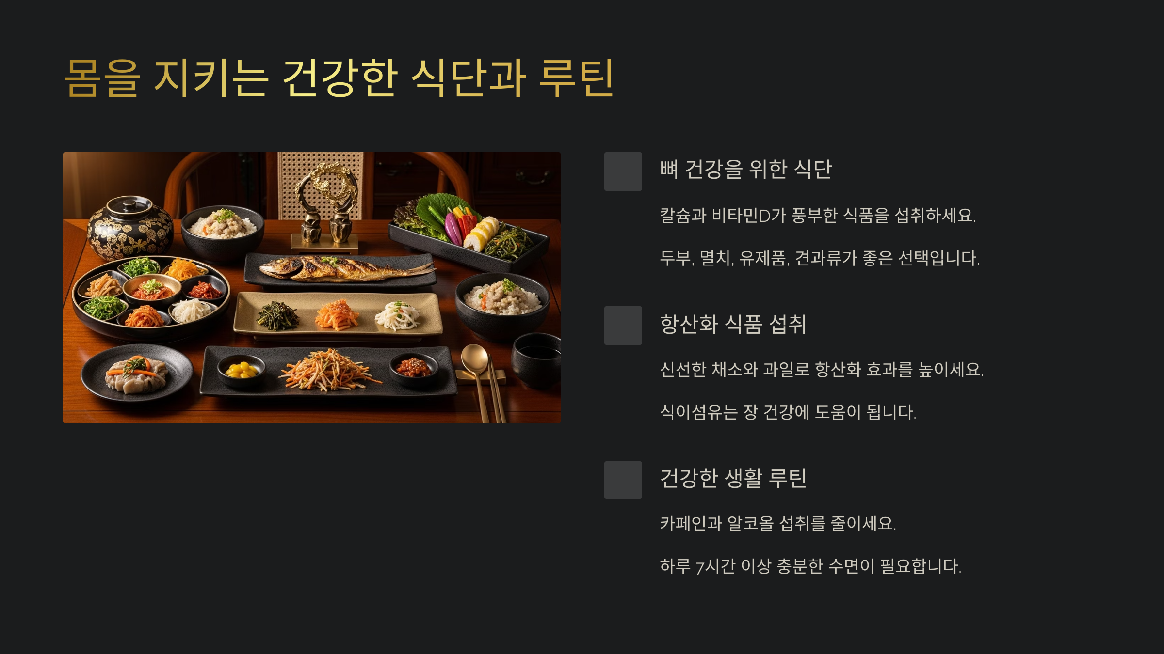 | 아침 | 들깨죽, 미역국 | 위 보호, 오메가3 보충 |