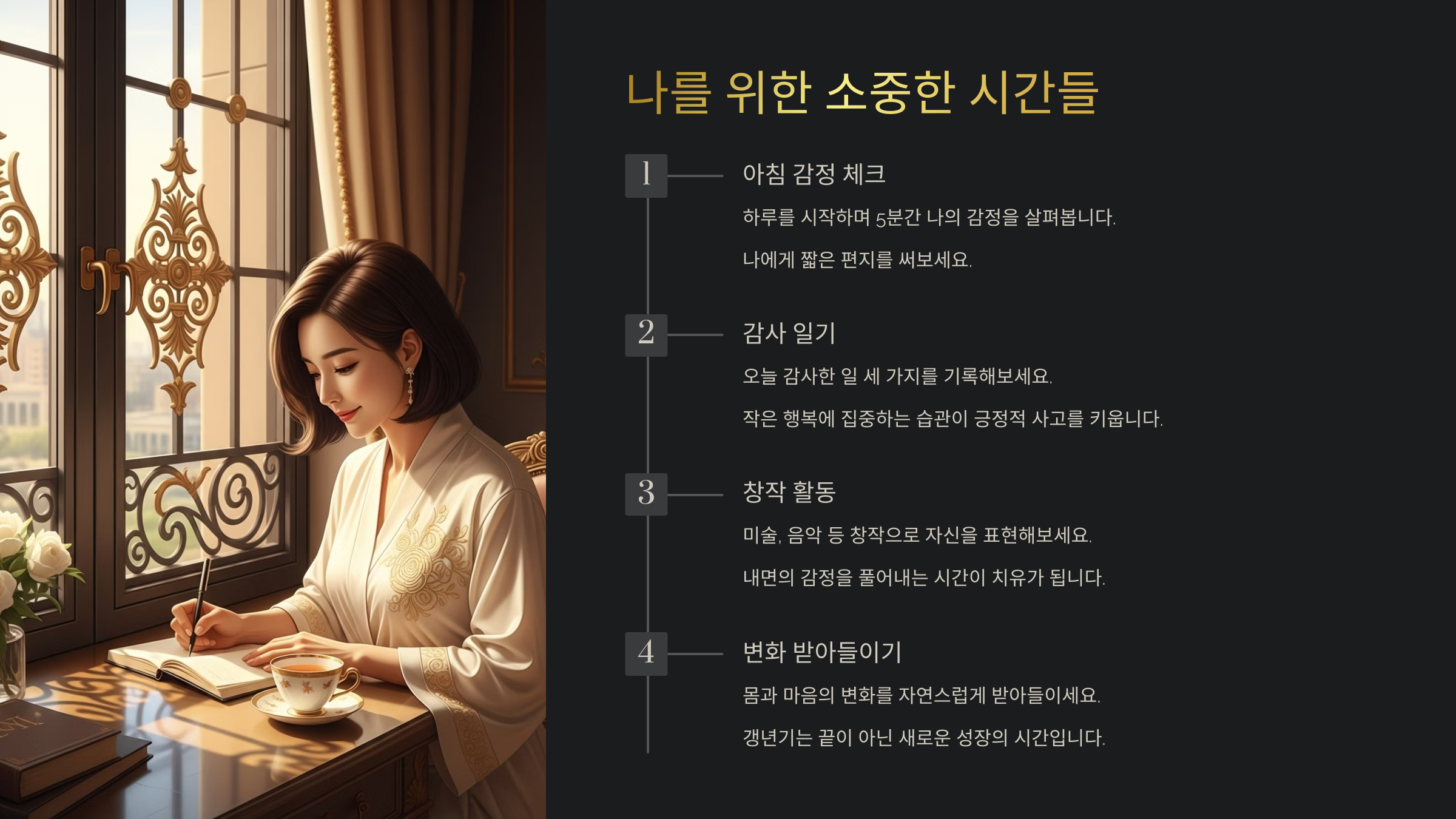 갱년기 증상은 통제할 수 없지만, 대응하는 태도는 우리가 선택할 수 있어요. 나를 돌보는 시간을 소중히 여기는 연습이 필요한 시기인 것 같아요.