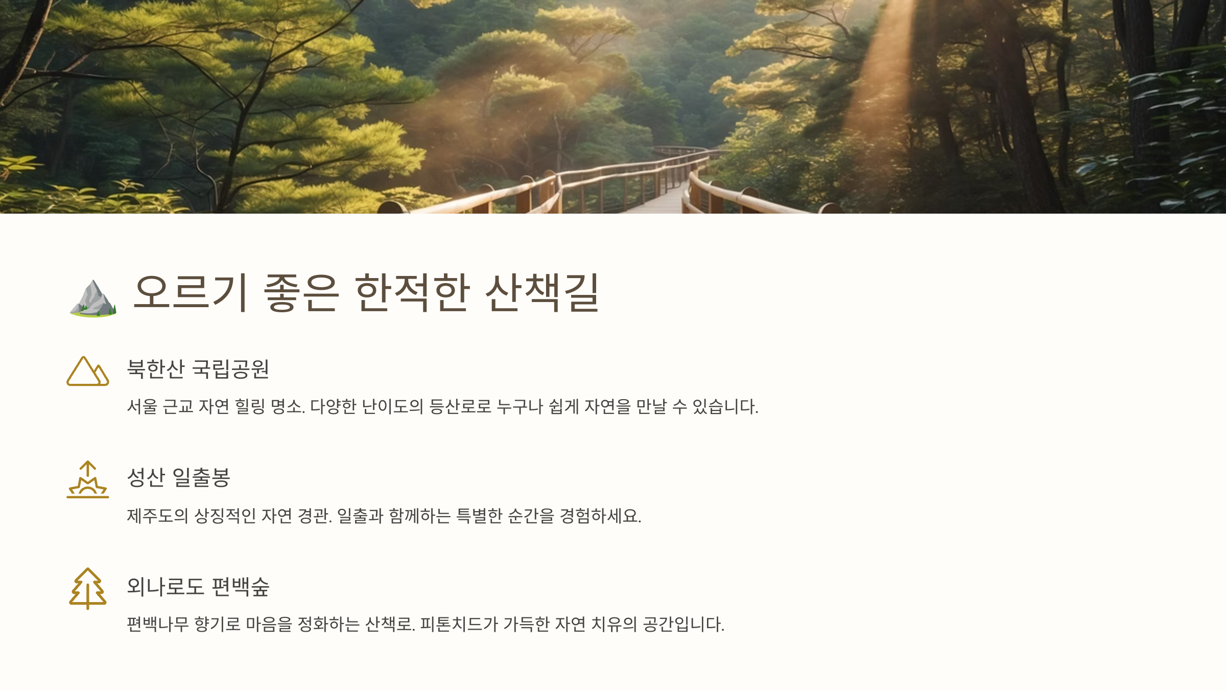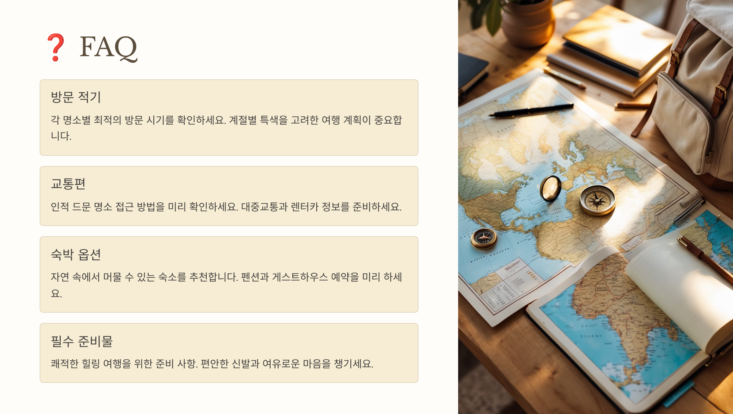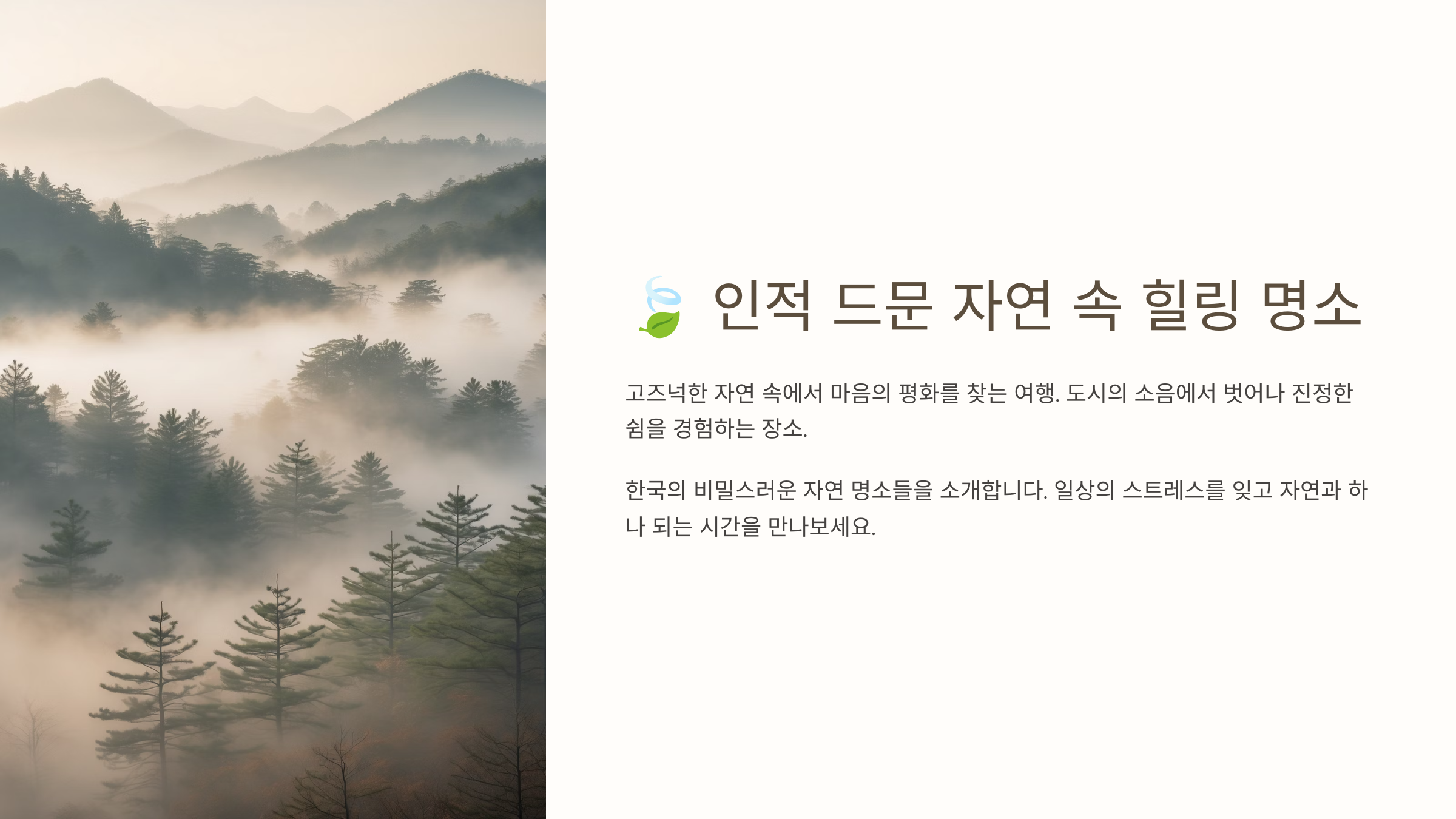여행지에서 중요한 건 '사람보다 자연'이라는 생각, 혹시 해본 적 있나요? 북적이는 핫플레이스 대신, 진짜 쉬어갈 수 있는 공간이 필요하다면 이 글이 정답이에요. 2025년 현재 기준, 잘 알려지지 않았지만 현지인들이 추천하는 국내 숨은 힐링 명소들을 소개해드릴게요.