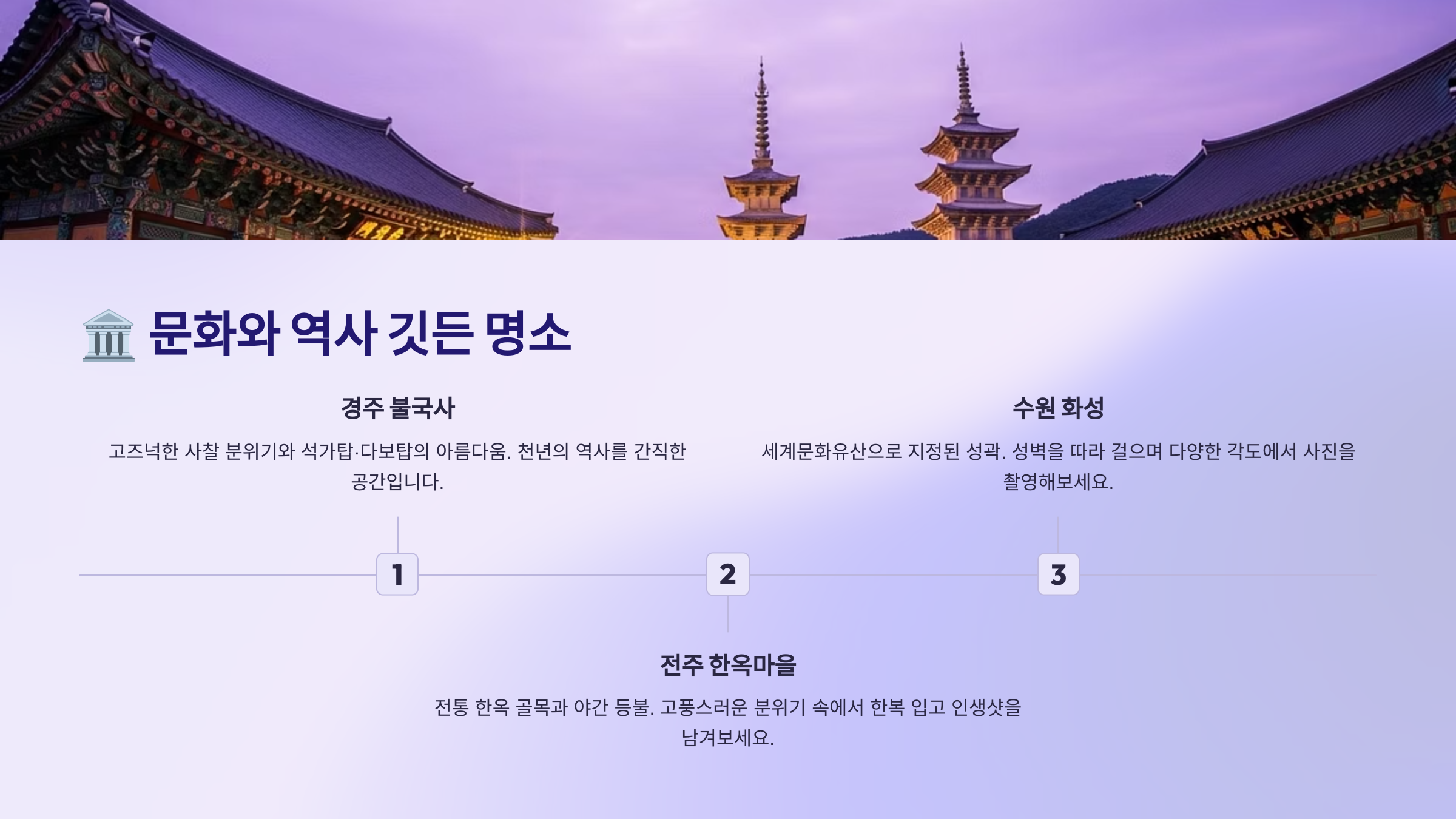 | 전주한옥마을 | 한복 체험 + 전통 건물 | 한국적인 고즈넉함 |
