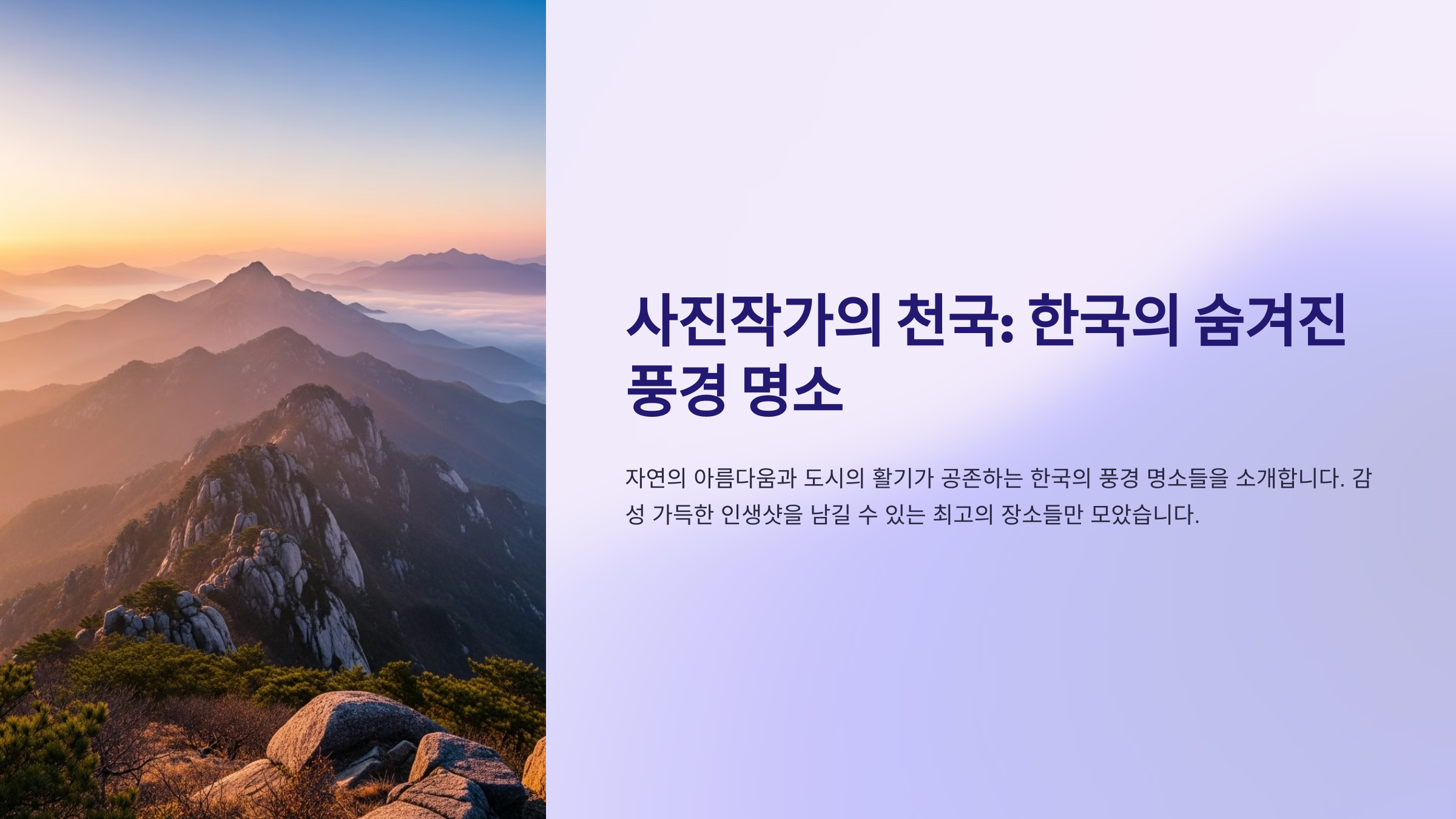 자연은 언제나 최고의 예술가예요. 📷 특히 넓은 하늘, 푸른 산, 평화로운 호수는 그 자체만으로도 작품이 되는 순간을 만들어주죠. 국내에서도 계절마다 다른 매력을 선사하는 자연 풍경 명소들이 가득해요. 봄에는 꽃이 흐드러지게 핀 유채밭, 여름에는 청량한 바다, 가을에는 붉게 물든 단풍, 겨울에는 눈 내리는 설경까지 정말 다양하답니다.
