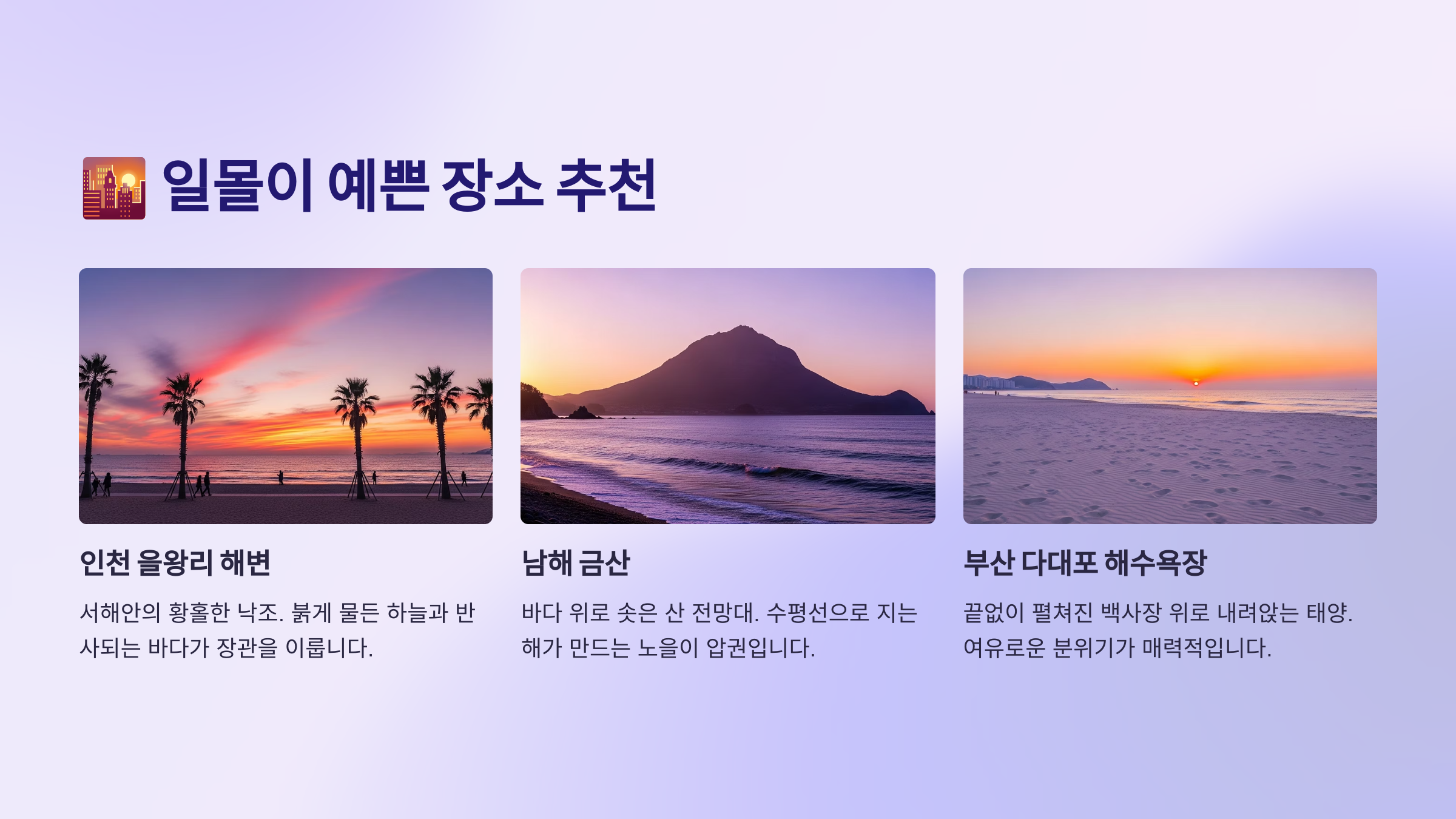 하늘이 붉게 물드는 그 순간, 사진은 감정을 담은 작품이 돼요. 🌅 일몰은 하루 중 가장 드라마틱한 빛의 변화가 일어나는 때라서, 어떤 장소든 이 시간만큼은 마법처럼 변신해요. 노을빛이 비치는 바다, 들판, 도시의 하늘 위에서 인생샷을 남길 수 있는 명소들을 소개할게요!