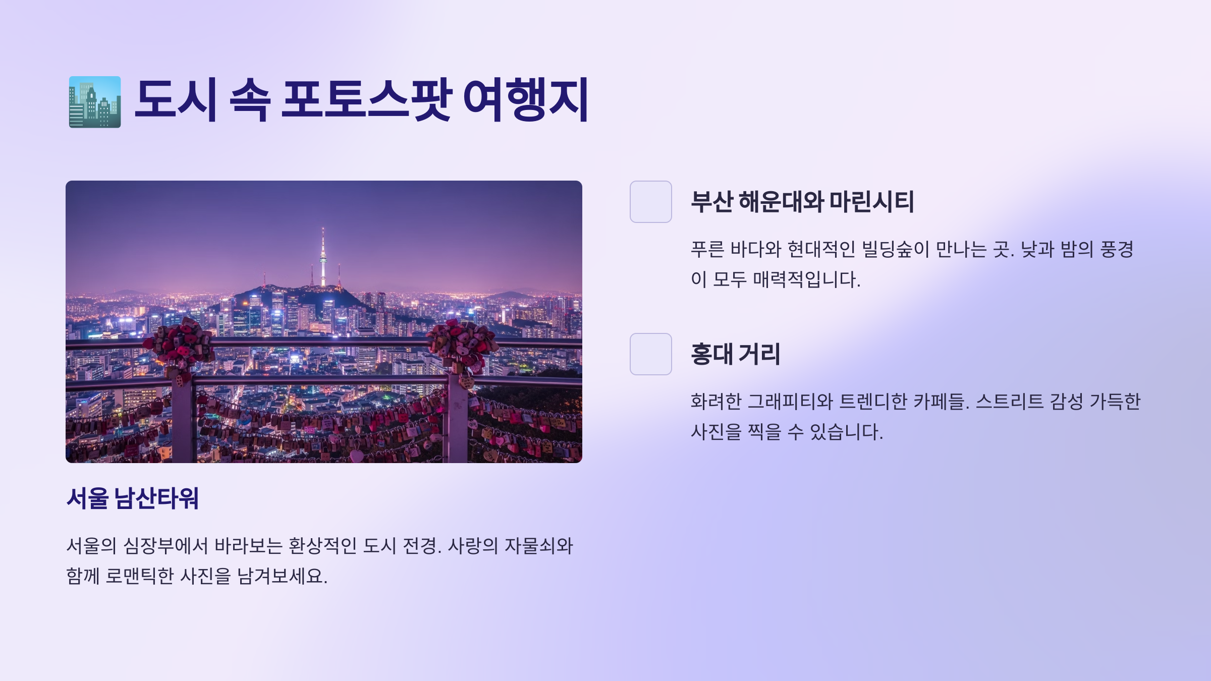 도시 여행의 매력은 시간에 따라 분위기가 다르게 변한다는 점이에요. 아침에는 고요하고, 낮에는 활기차고, 밤에는 조명이 화려하죠. 그래서 같은 장소에서도 다른 느낌의 사진을 여러 장 찍을 수 있어요. 📷