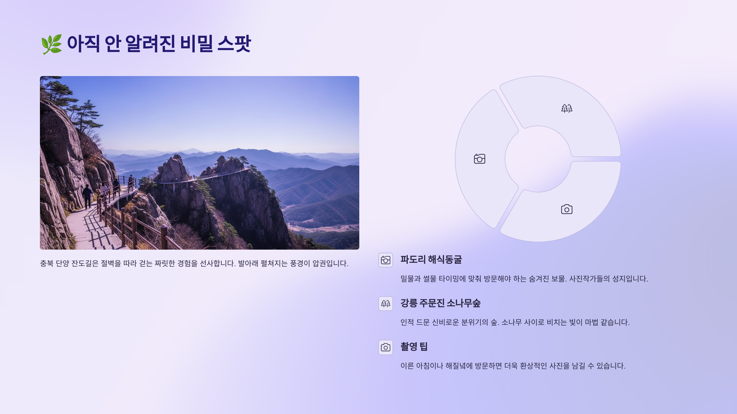 대중적인 포토존도 좋지만, 진짜 특별한 사진을 원한다면 아직 잘 알려지지 않은 숨은 명소를 찾아야 해요. 이런 곳들은 한적해서 오롯이 장소의 분위기를 즐기면서 촬영할 수 있고, 똑같은 각도의 ‘템플릿 사진’이 아닌 나만의 감성이 담긴 결과물을 만들 수 있답니다. 📷