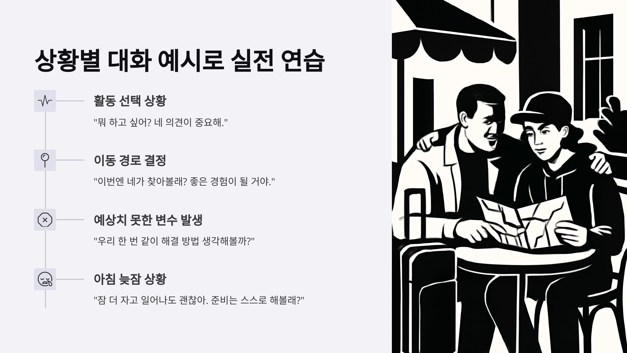 이제 본격적으로 각 섹션을 살펴볼게요. 여행이 더 이상 '가족 행사'가 아닌, 모두가 즐기는 시간이 되도록 도와줄 거예요. 자녀의 표정을 바꾸고, 관계를 회복할 수 있는 말 한마디의 힘을 지금 느껴보세요.
