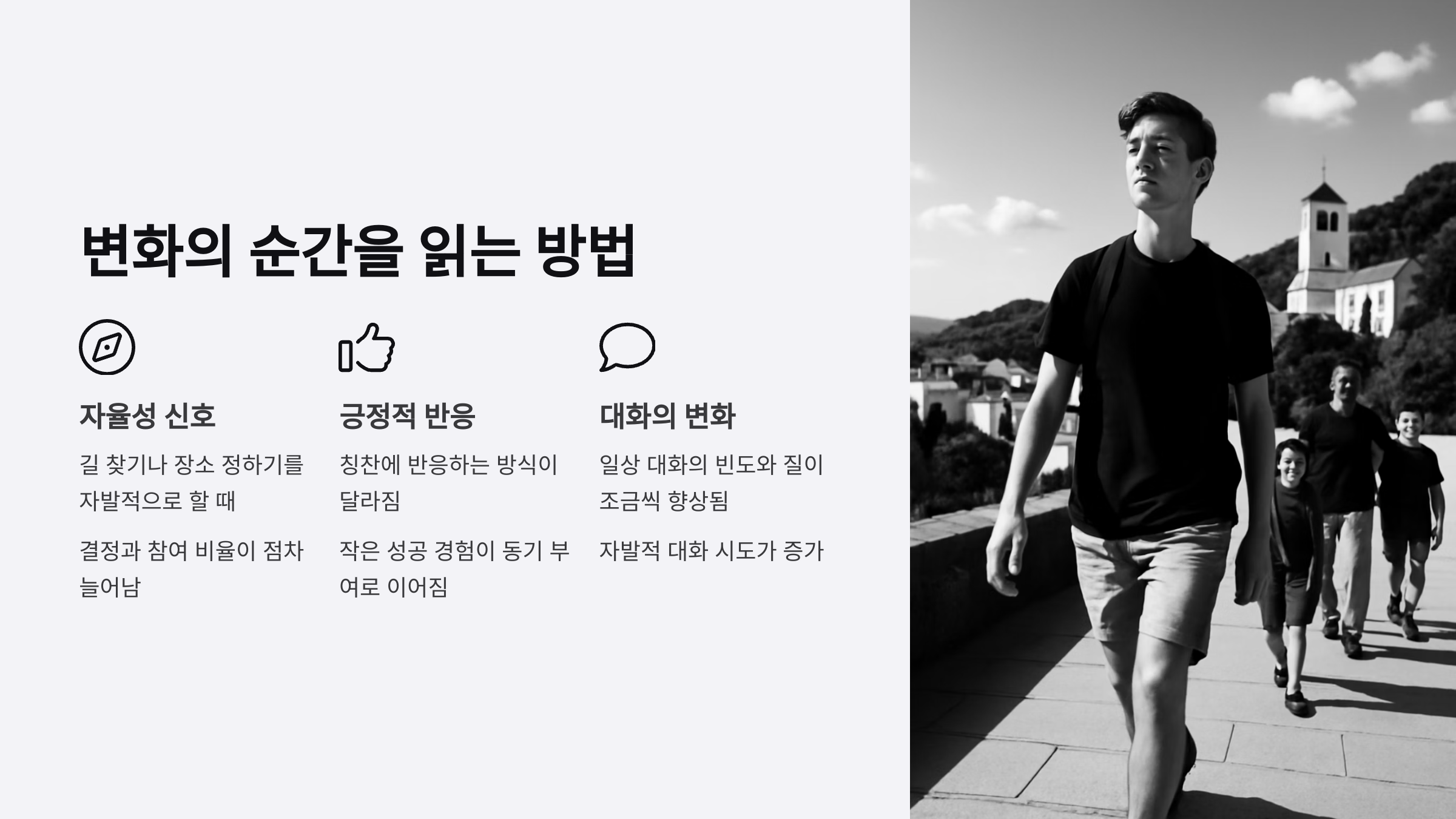 작은 변화는 말보다 표정, 태도, 눈빛에서 먼저 드러나요. 무뚝뚝했던 아이가 밥을 같이 먹자고 할 때, 짜증을 덜 낼 때, 음악을 공유할 때 등 이런 사소한 신호들을 민감하게 읽는 게 중요해요.